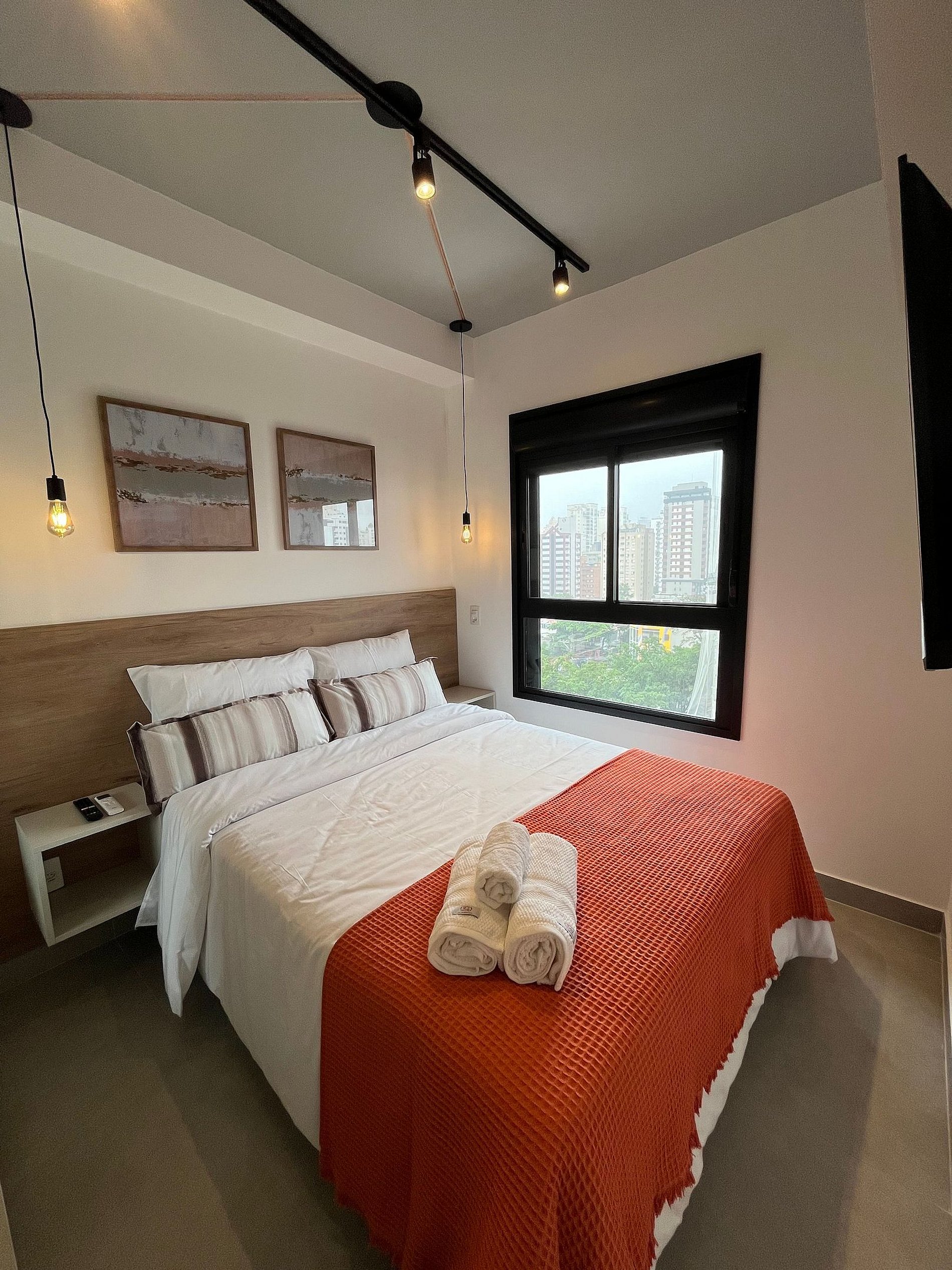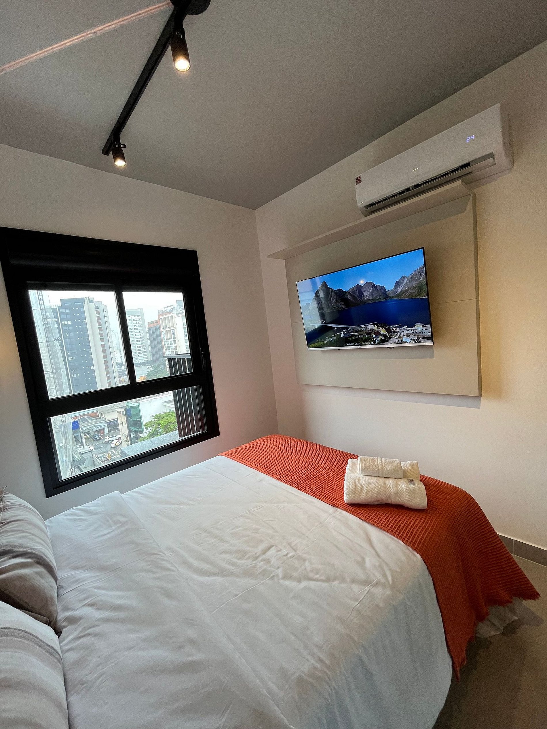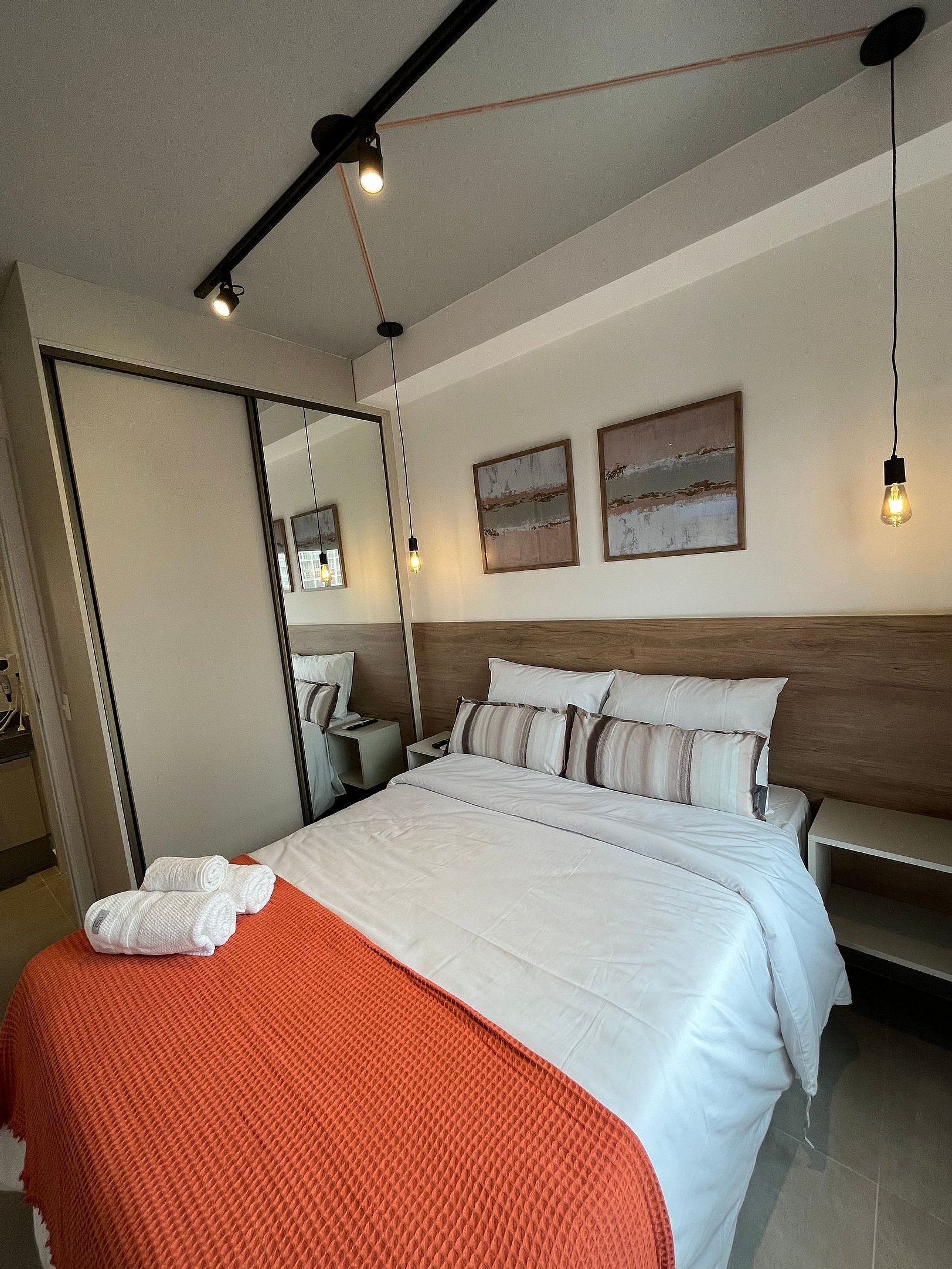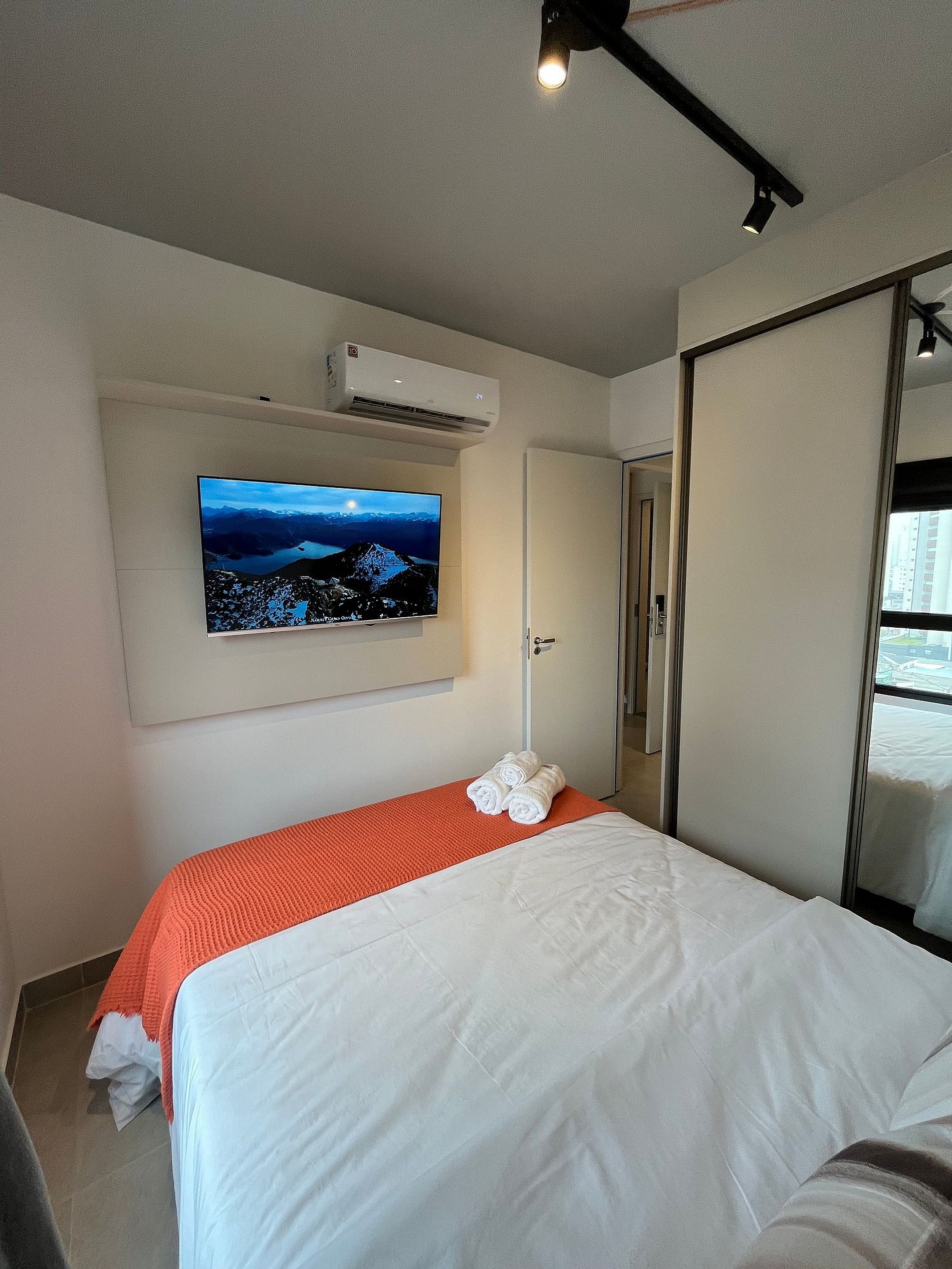 Apartamento de 1 dormitório | 9° andar QUARTO - Cama Casal (1,38cmx 1,88cm) - 1x Jogo de cama e edredom ou manta- Guarda-roupa espelhado com cabides - Ar condicionado- Smart TV 43 polegadas com Netflix e outros aplicativos - Internet de alta velocidade - WI-FI 250MB - Ferro de passar roupa - Persiana com sistema 100% Black-out