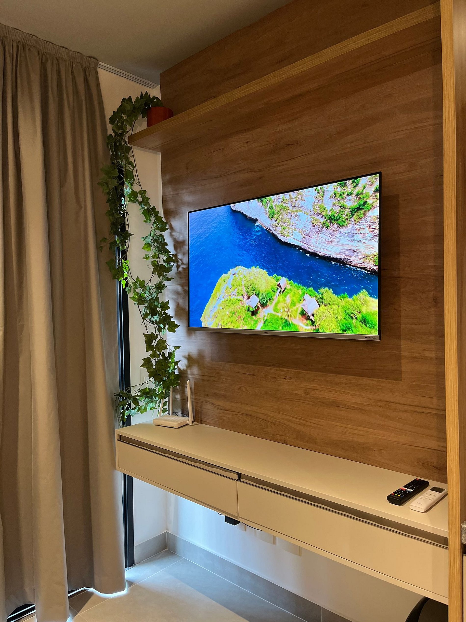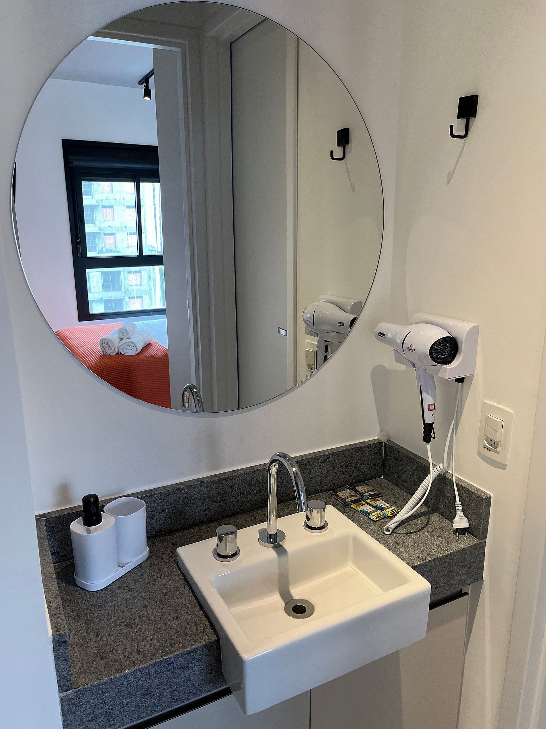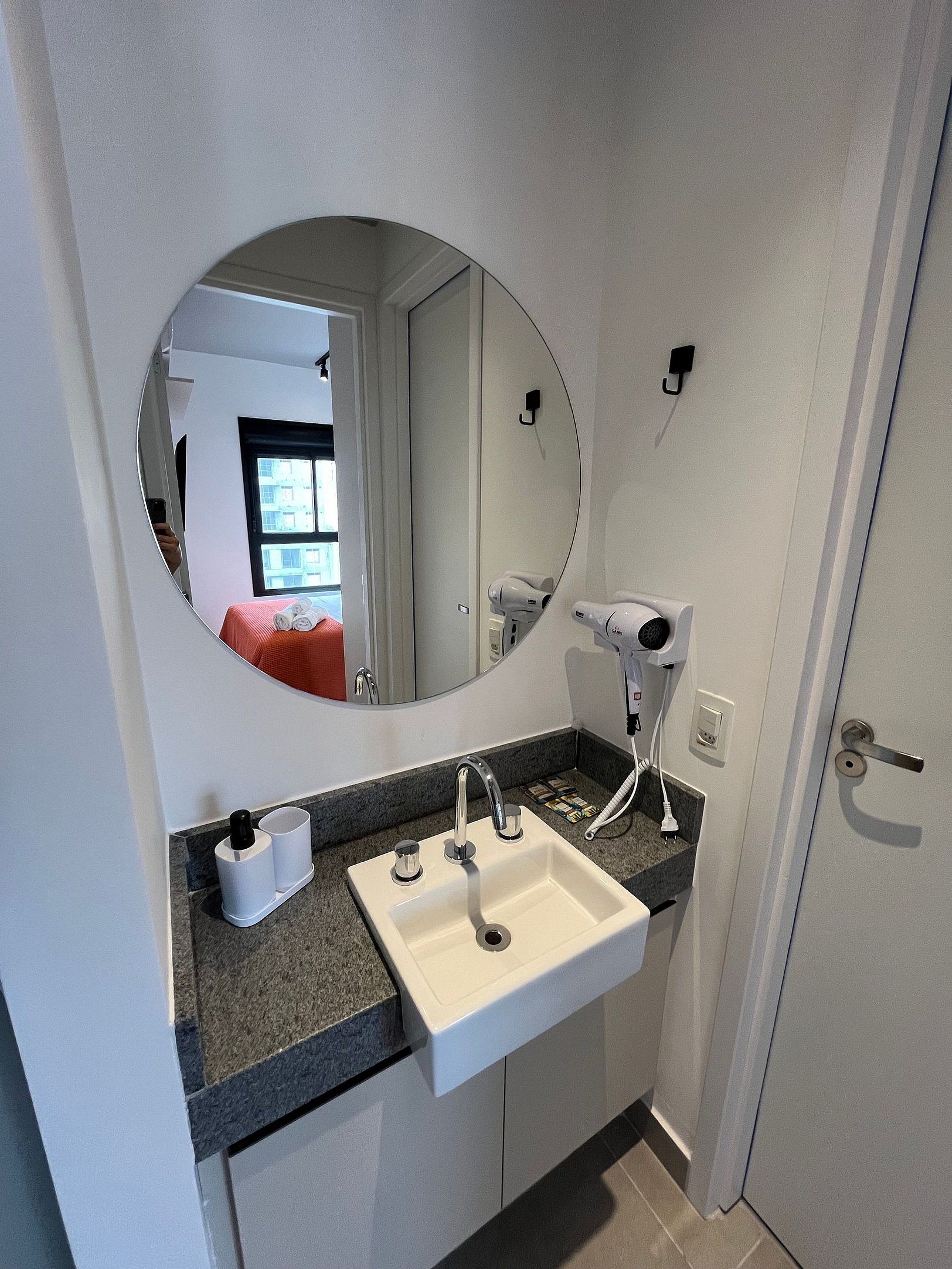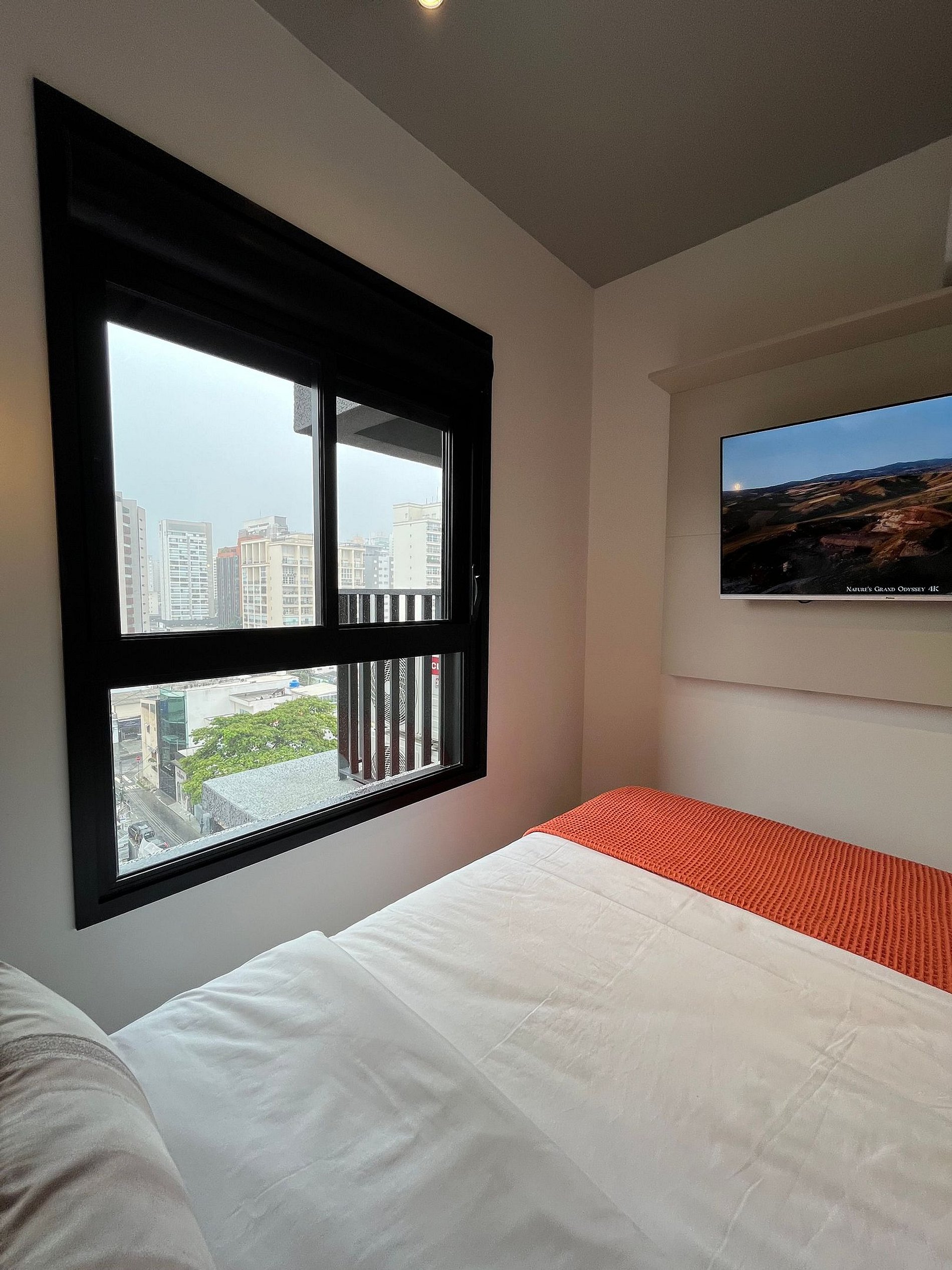 Apartamento de 1 dormitório | 9° andar QUARTO - Cama Casal (1,38cmx 1,88cm) - 1x Jogo de cama e edredom ou manta- Guarda-roupa espelhado com cabides - Ar condicionado- Smart TV 43 polegadas com Netflix e outros aplicativos - Internet de alta velocidade - WI-FI 250MB - Ferro de passar roupa - Persiana com sistema 100% Black-out