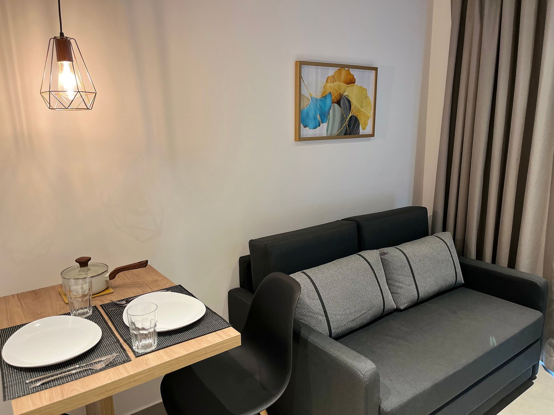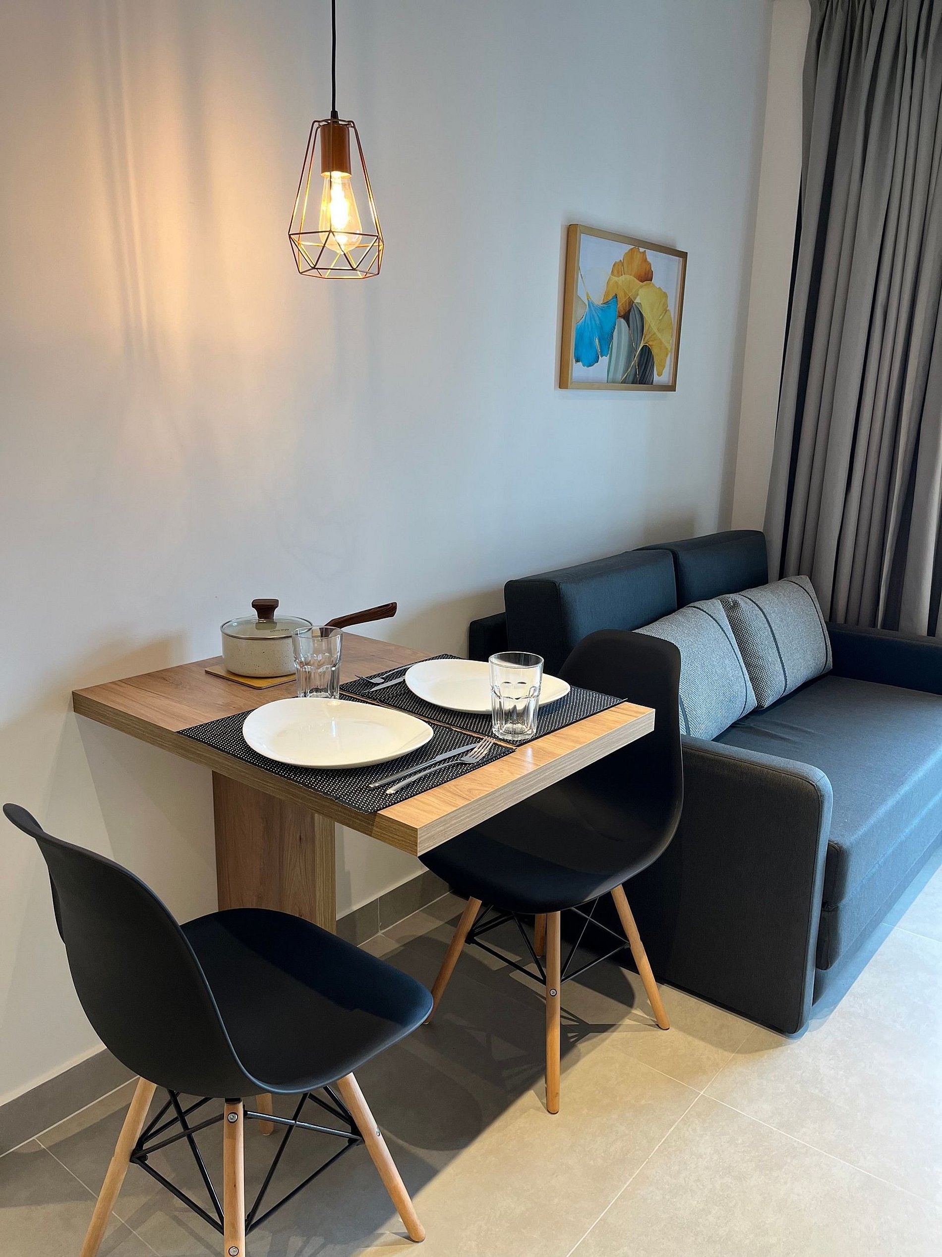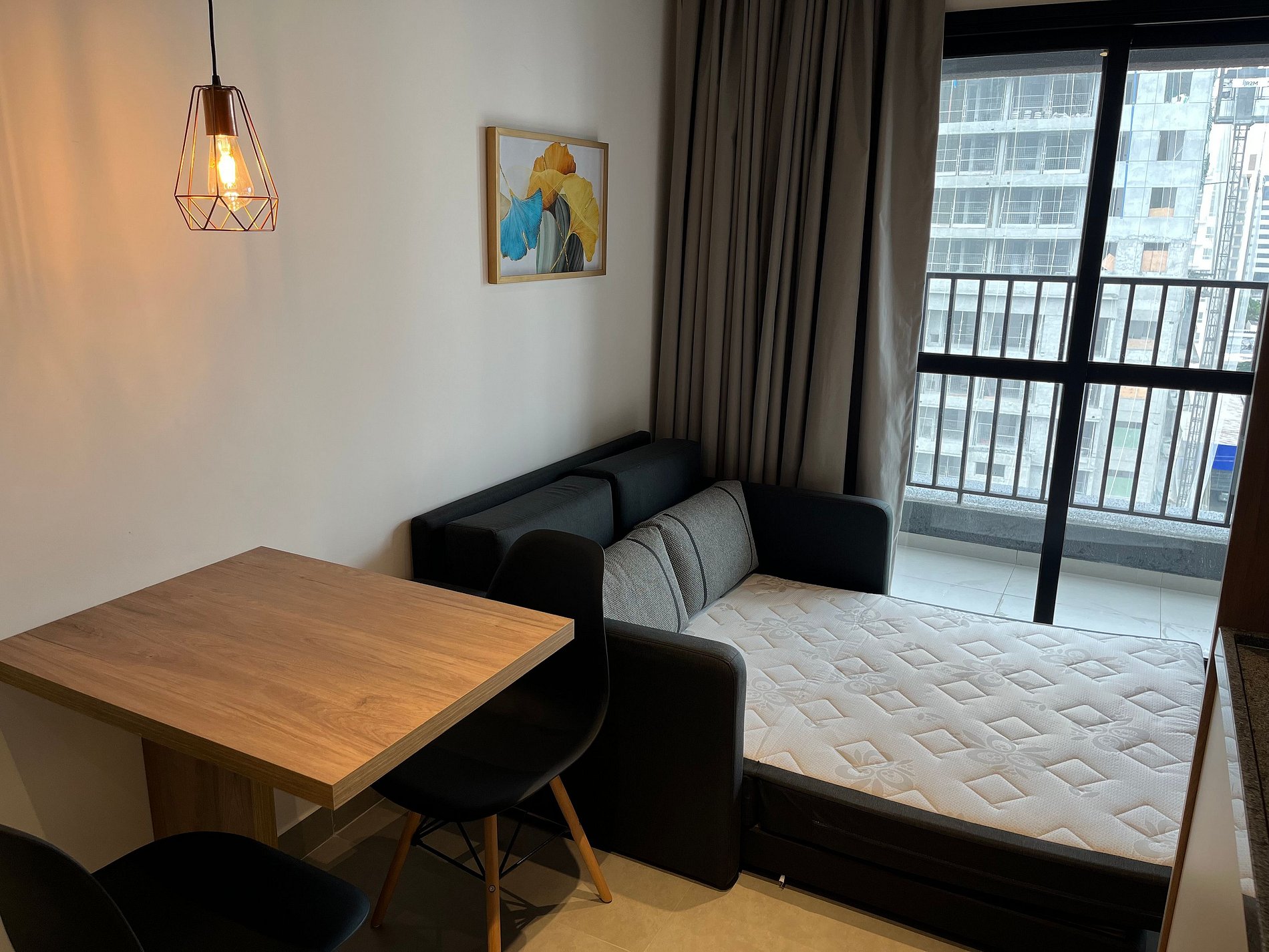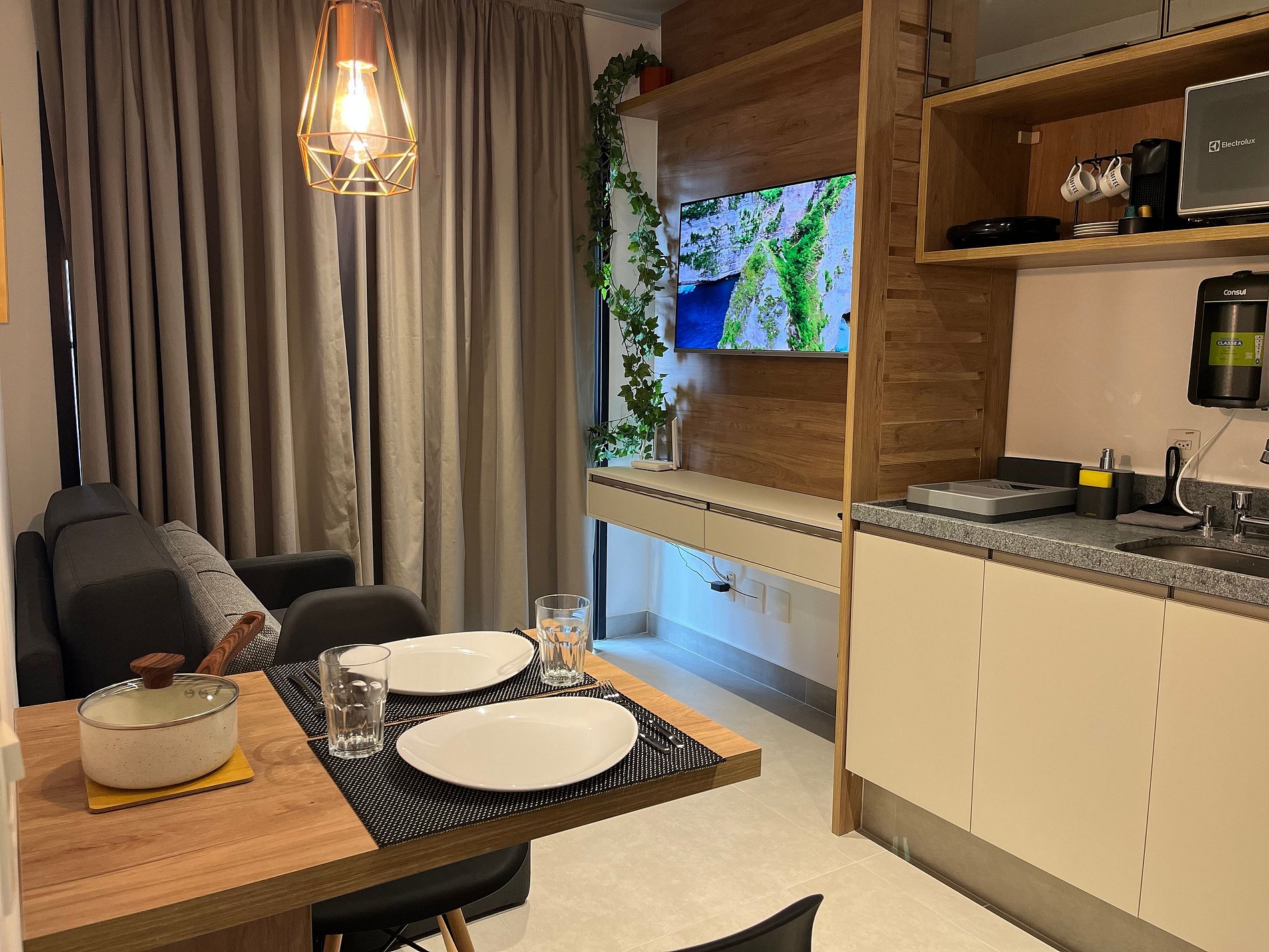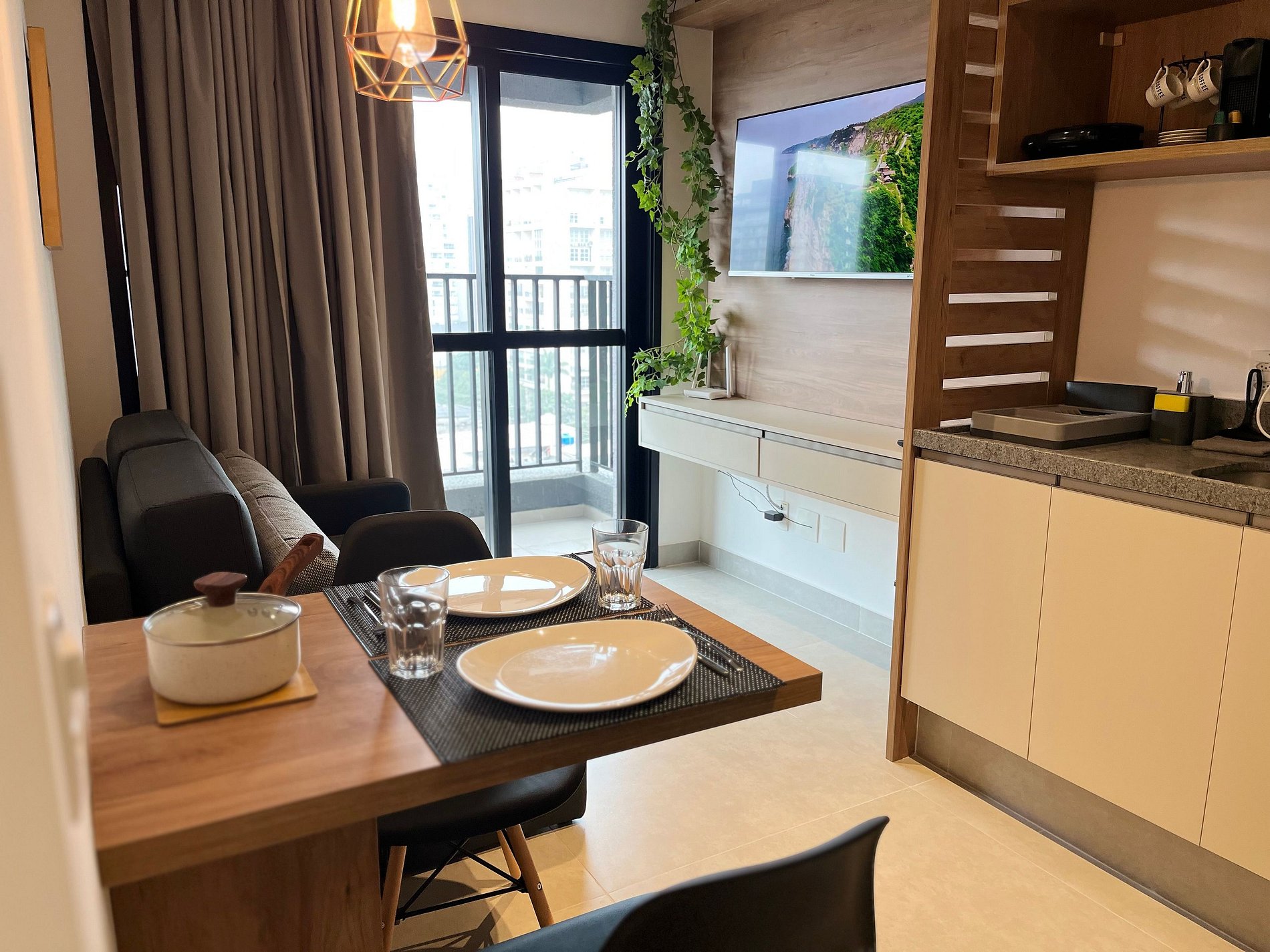 SALA - Sofá (2 Lugares) - TV Smart- Mesa de Jantar com 2 cadeiras **ATENÇÃO: Disponibilizamos o enxoval padrão para 2 hóspedes. Caso queira um kit extra (jogo de cama e manta), é possível solicitar mediante custo adicional, pois trabalhamos com lavanderia terceirizada.