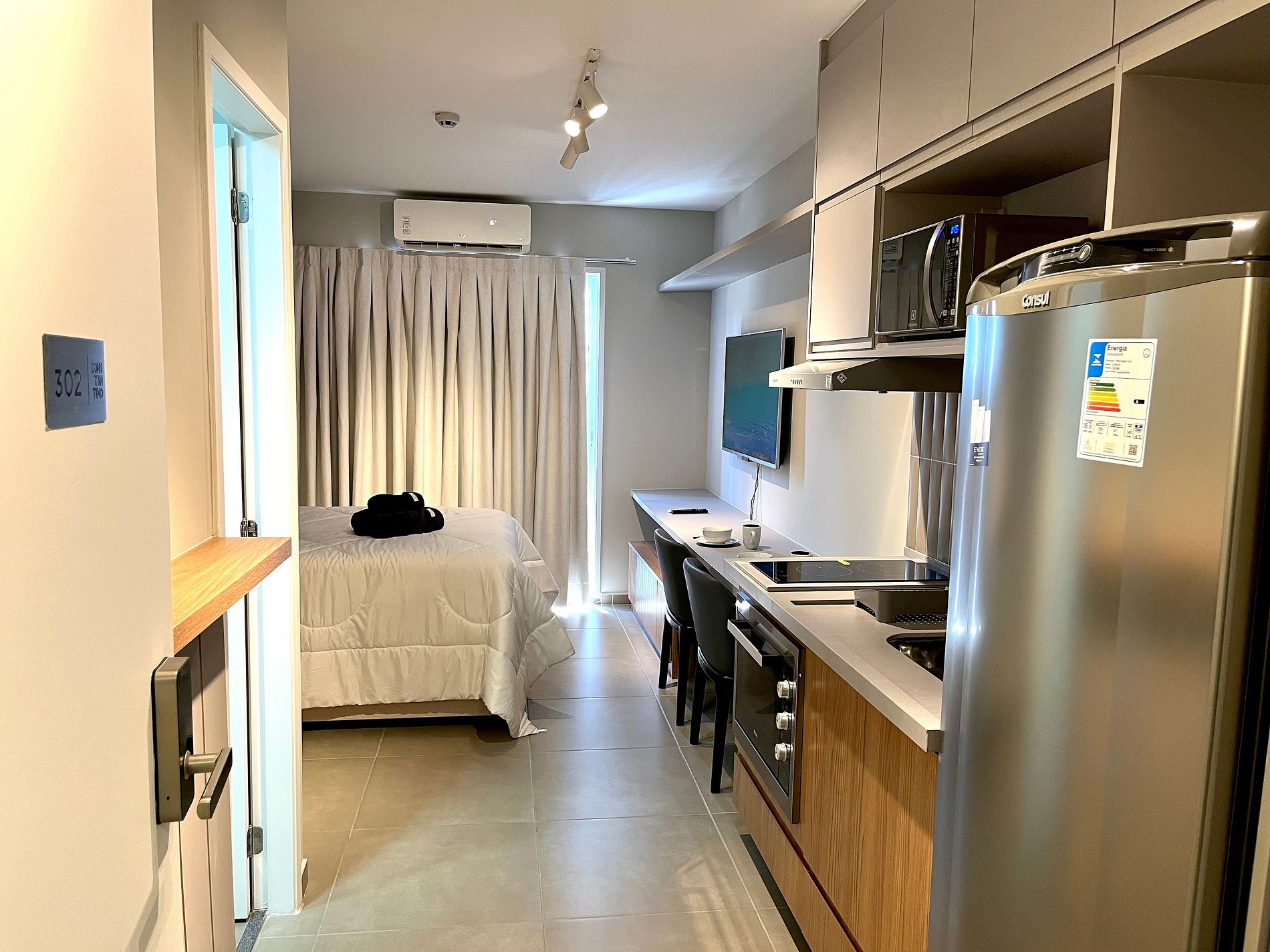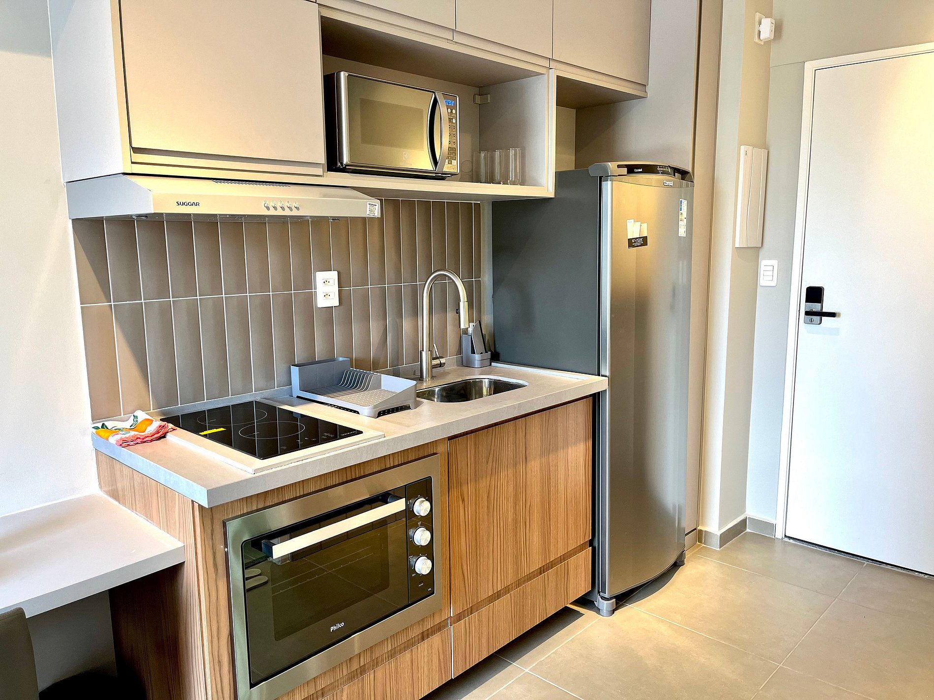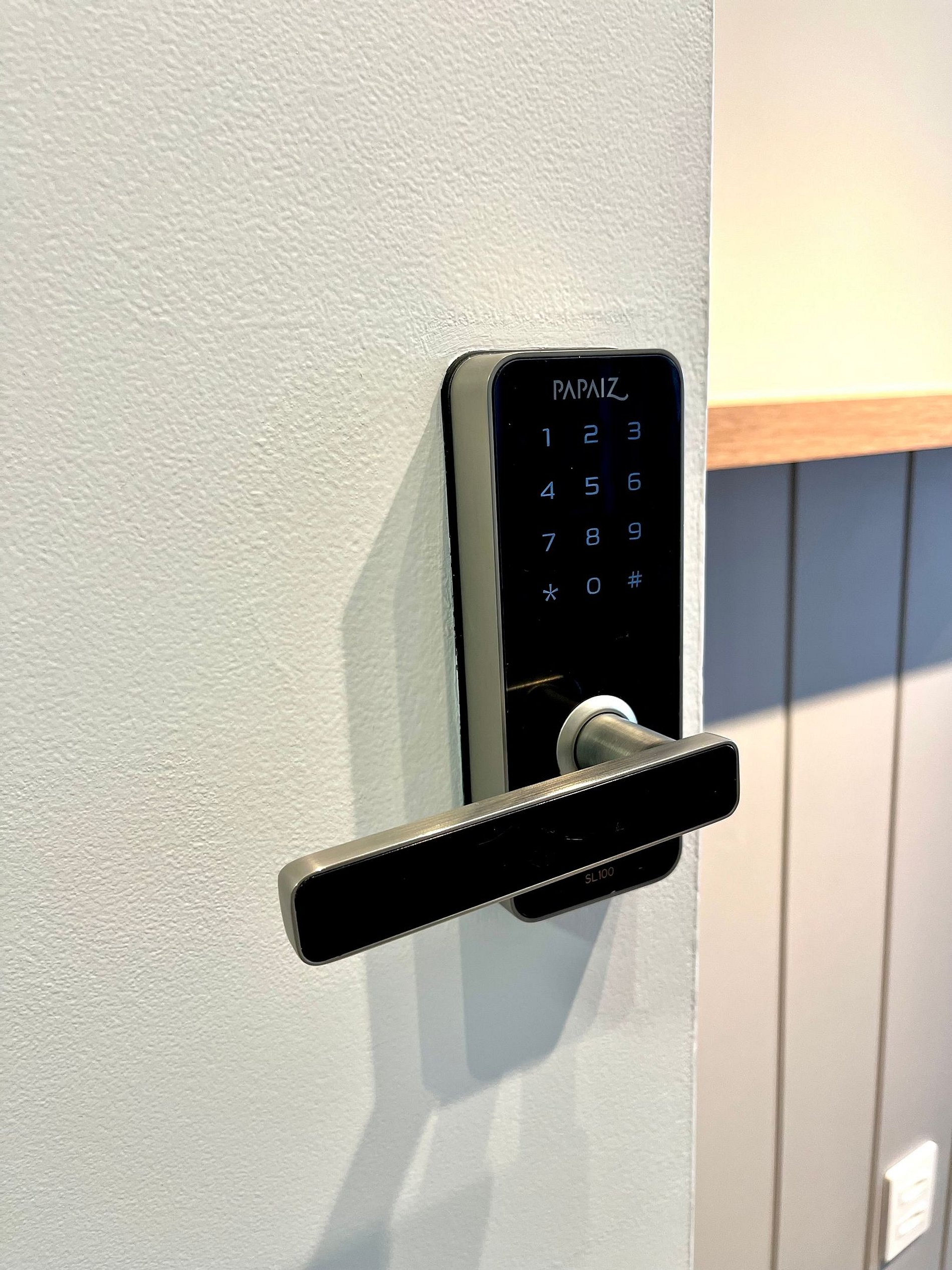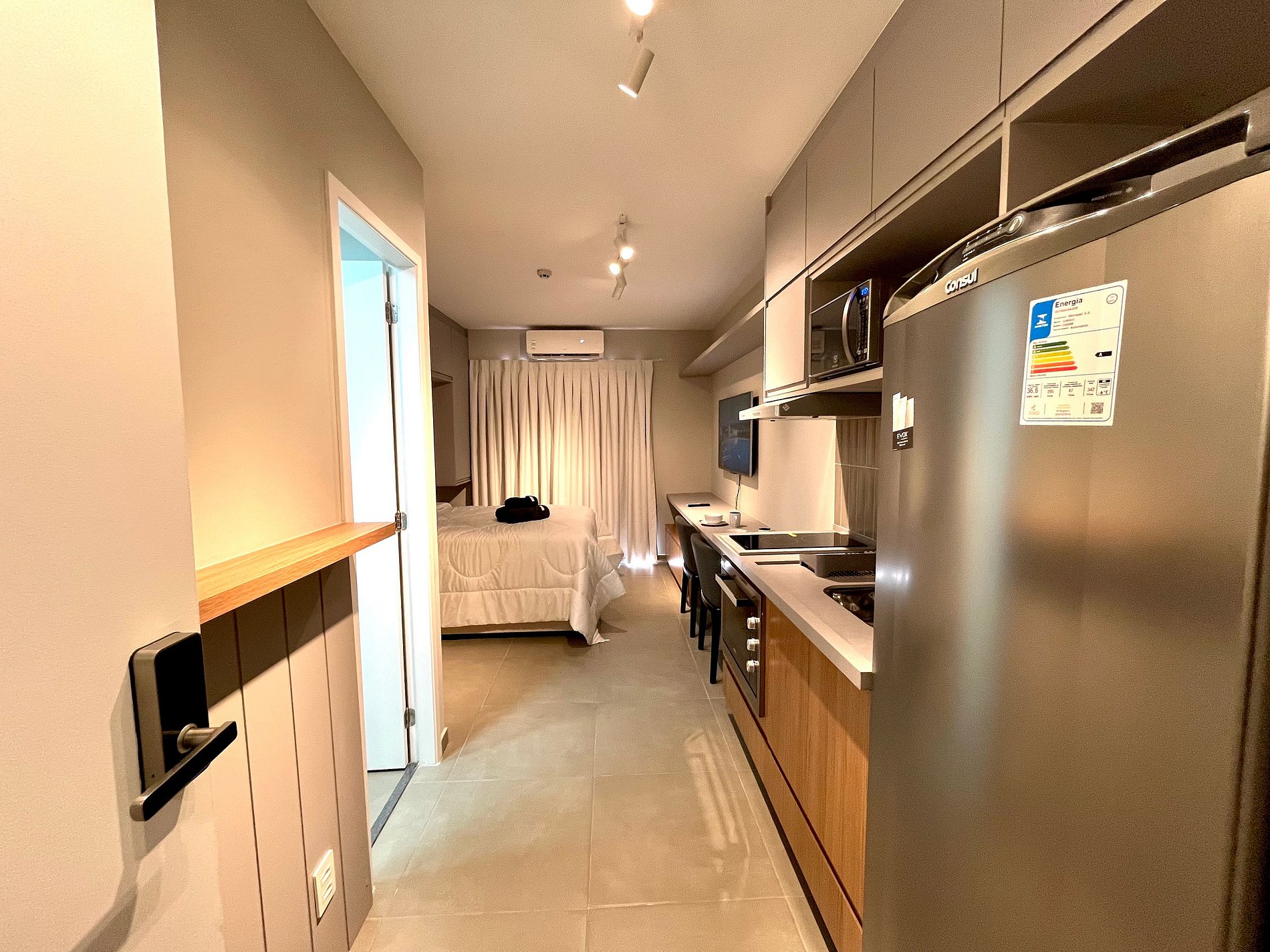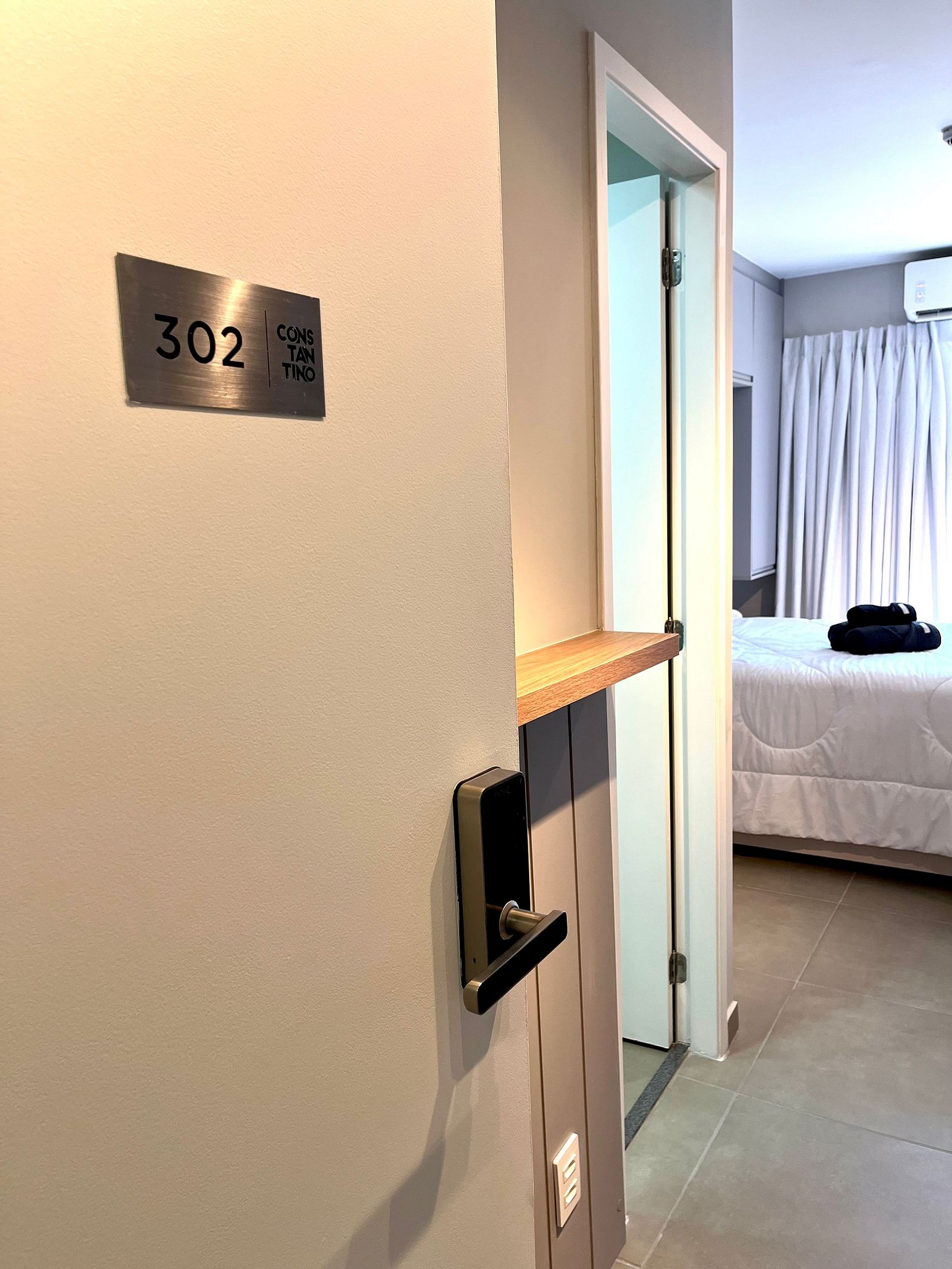 O acesso ao apartamento é feito de forma prática e segura através de uma fechadura inteligente.
