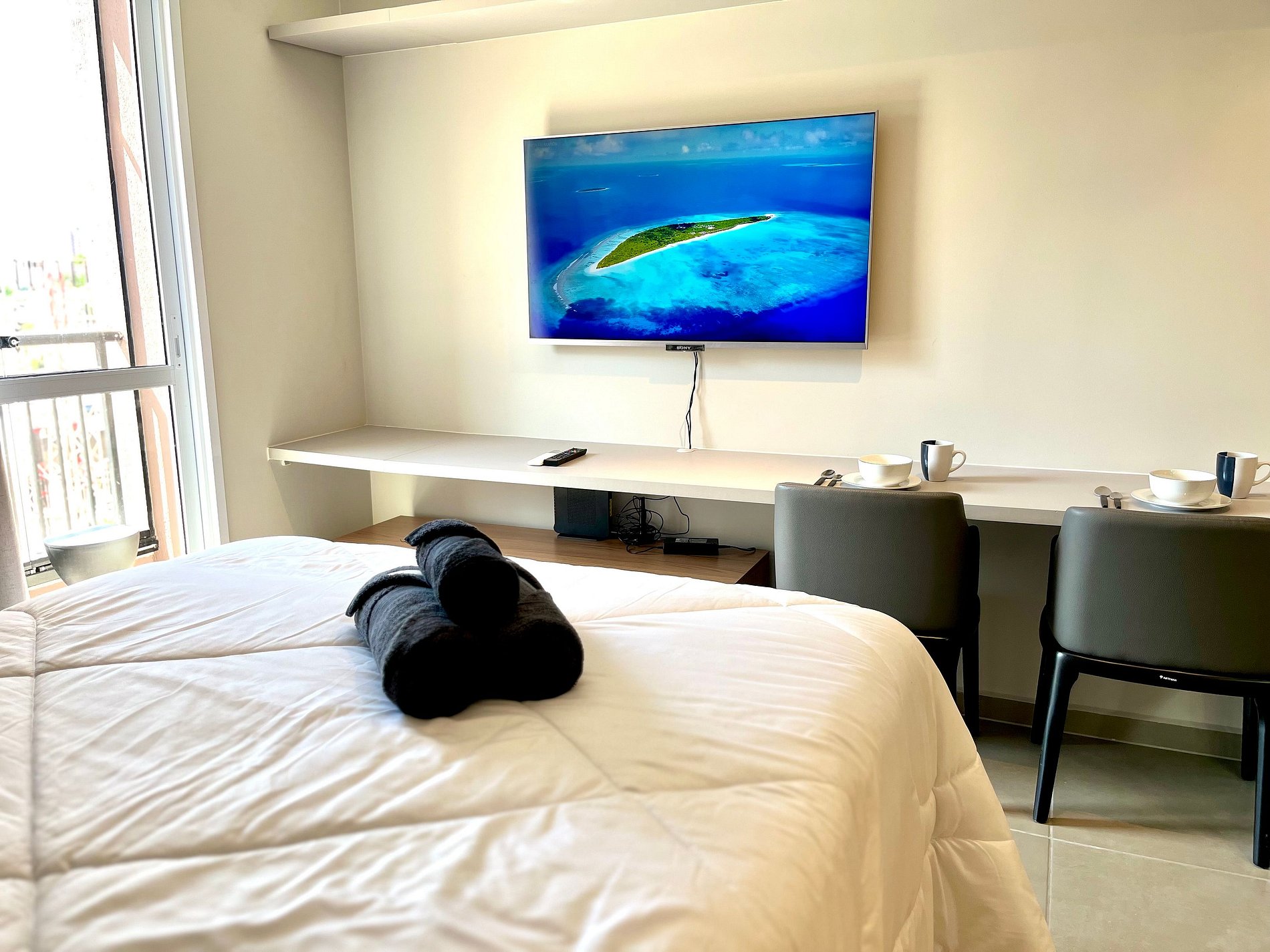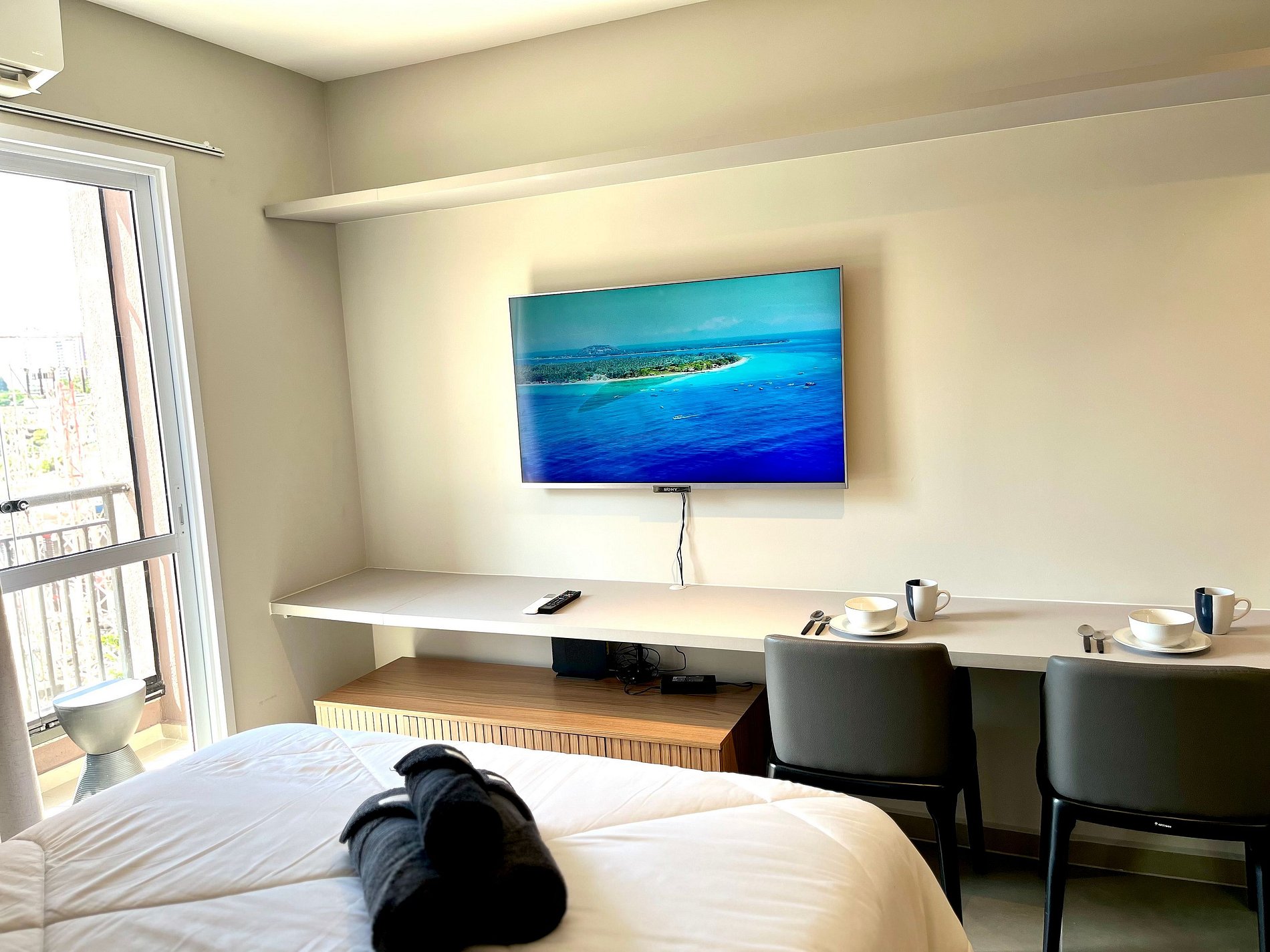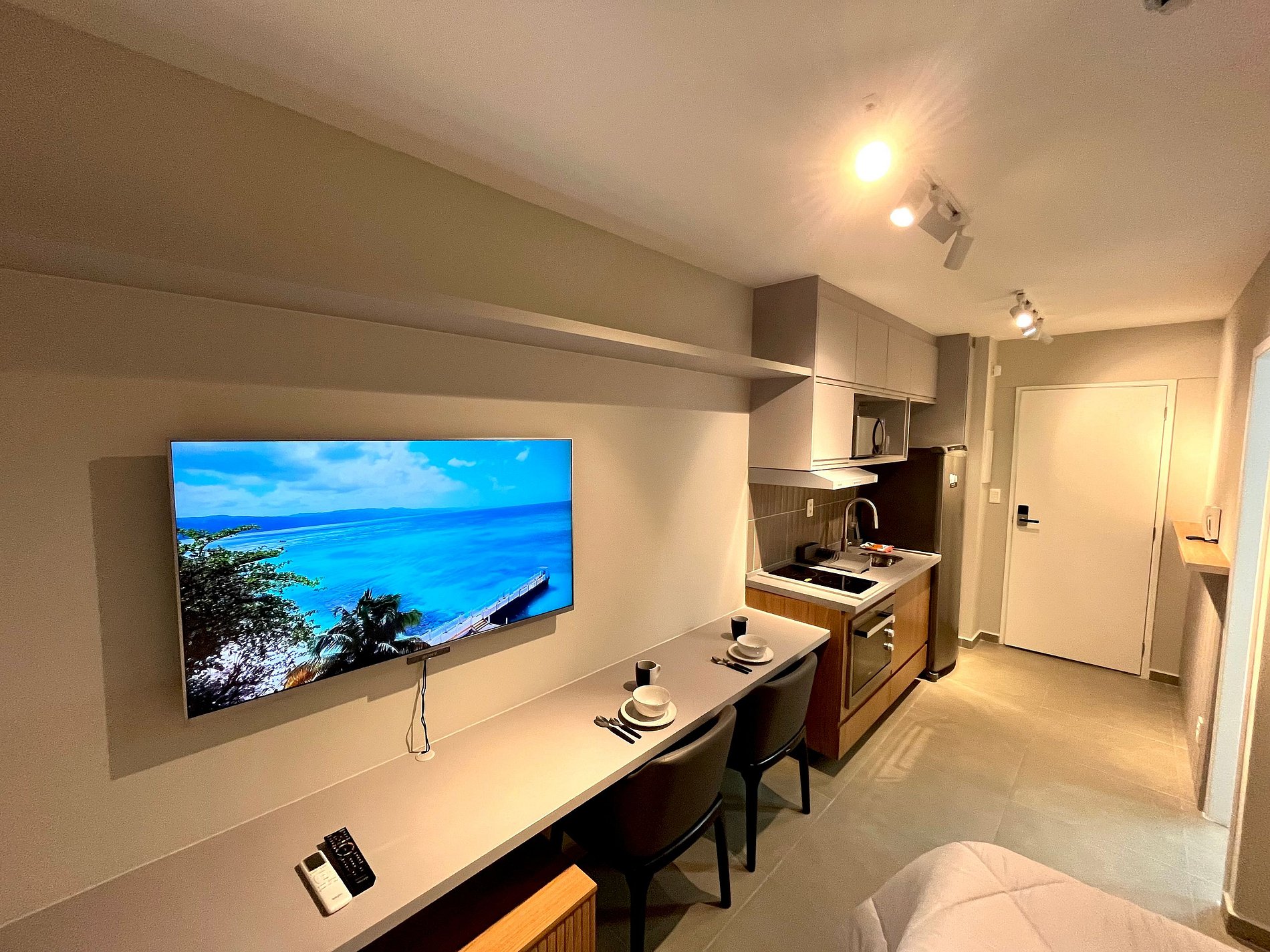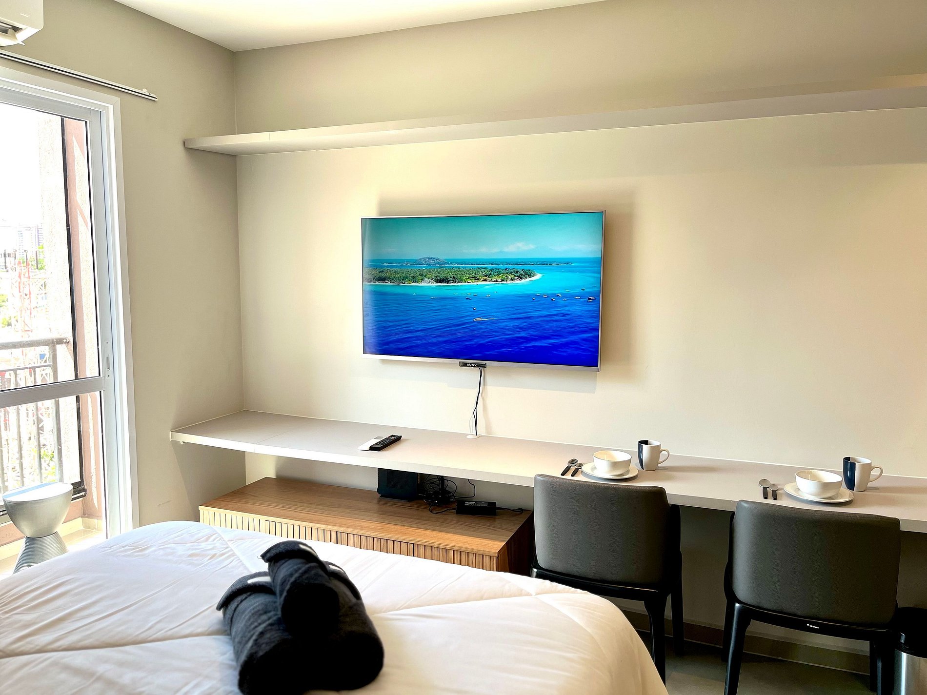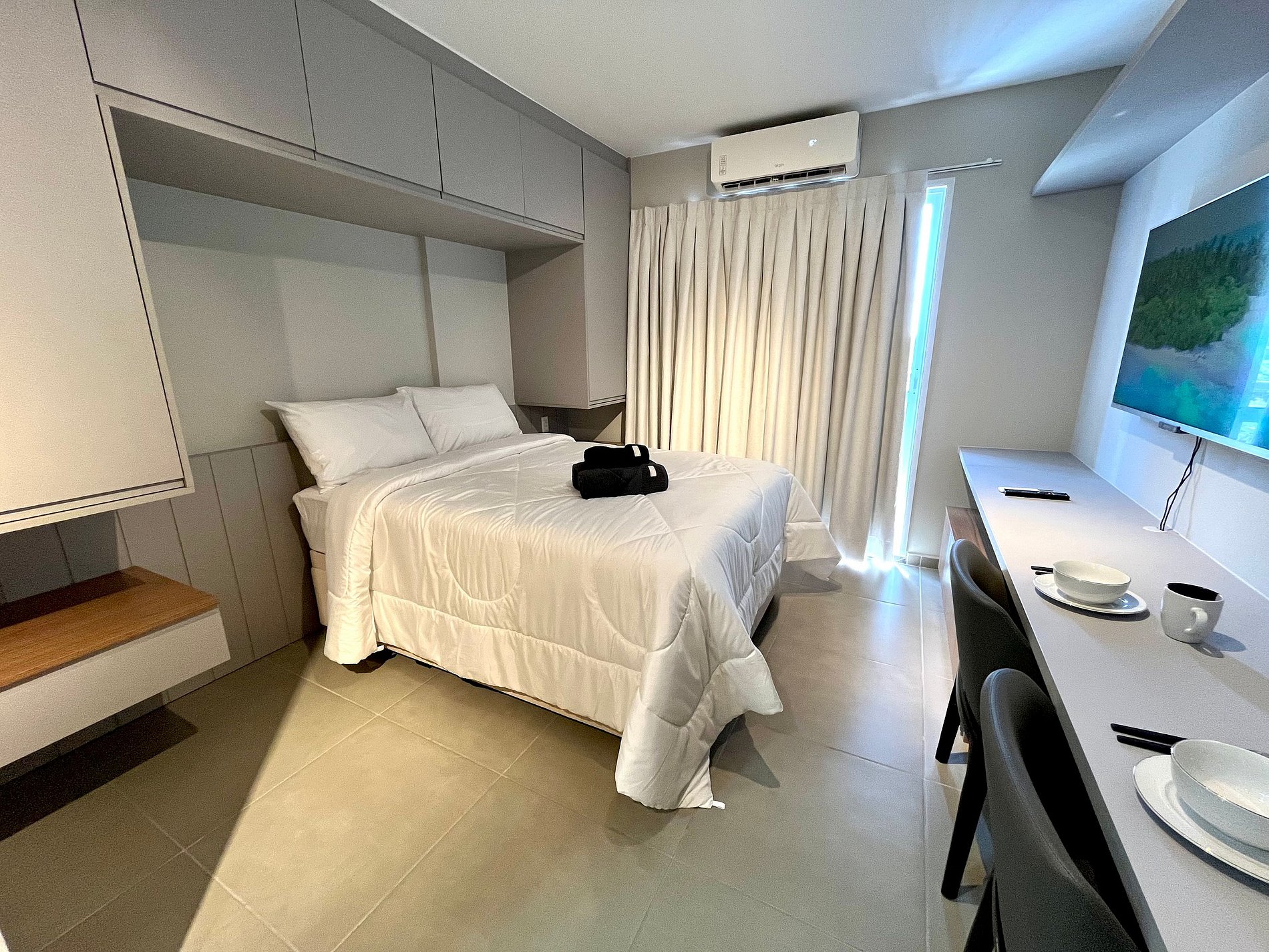Atenção: A Tv disponibilizada para este apartamento é de um padrão mais antigo. Funciona tranquilamente para os canais abertos (Globo/ SBT e demais), mas não funciona para Netflix / Amazon / YouTube. e etc.