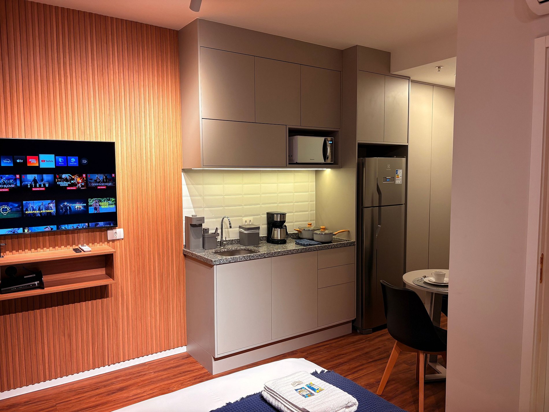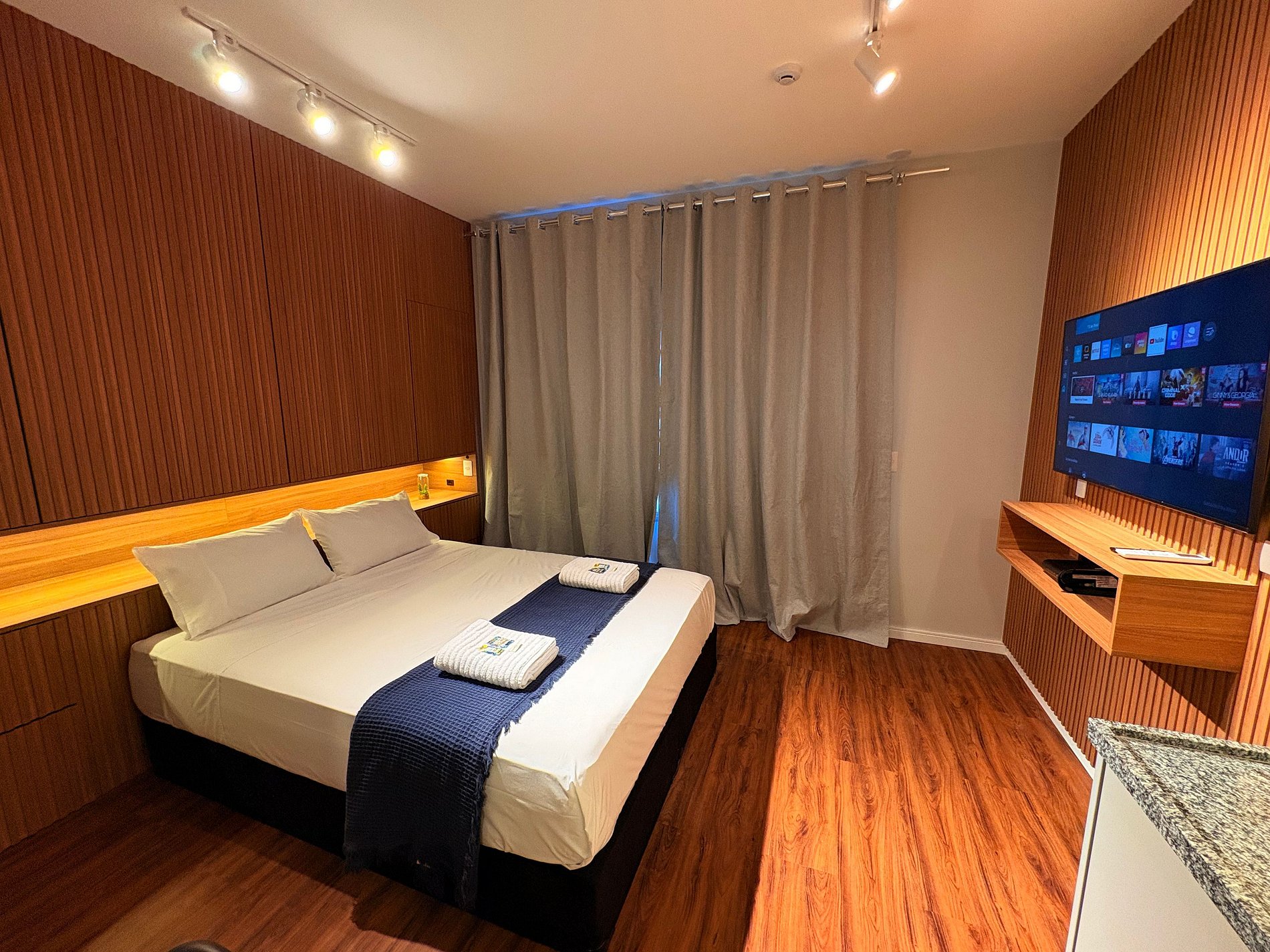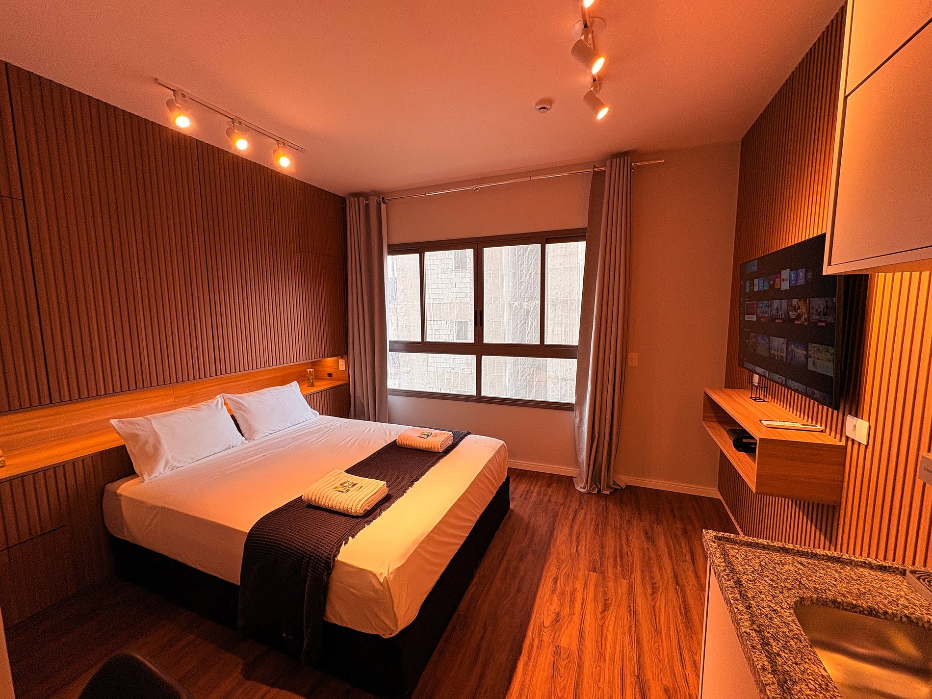 O studio é equipado com cama queen, ar-condicionado, internet, televisão smart e janela com cortinas blackout. Para maior comodidade, oferecemos um enxoval completo por estadia, incluindo:2 travesseiros, 2 toalhas de banho, 1 toalha de rosto, 1 tapete de piso, 1 lençol com elástico, 1 lençol sem elástico, 2 fronhas e 1 edredom ou coberdrom. Também disponibilizamos 2 amenities por hóspede.