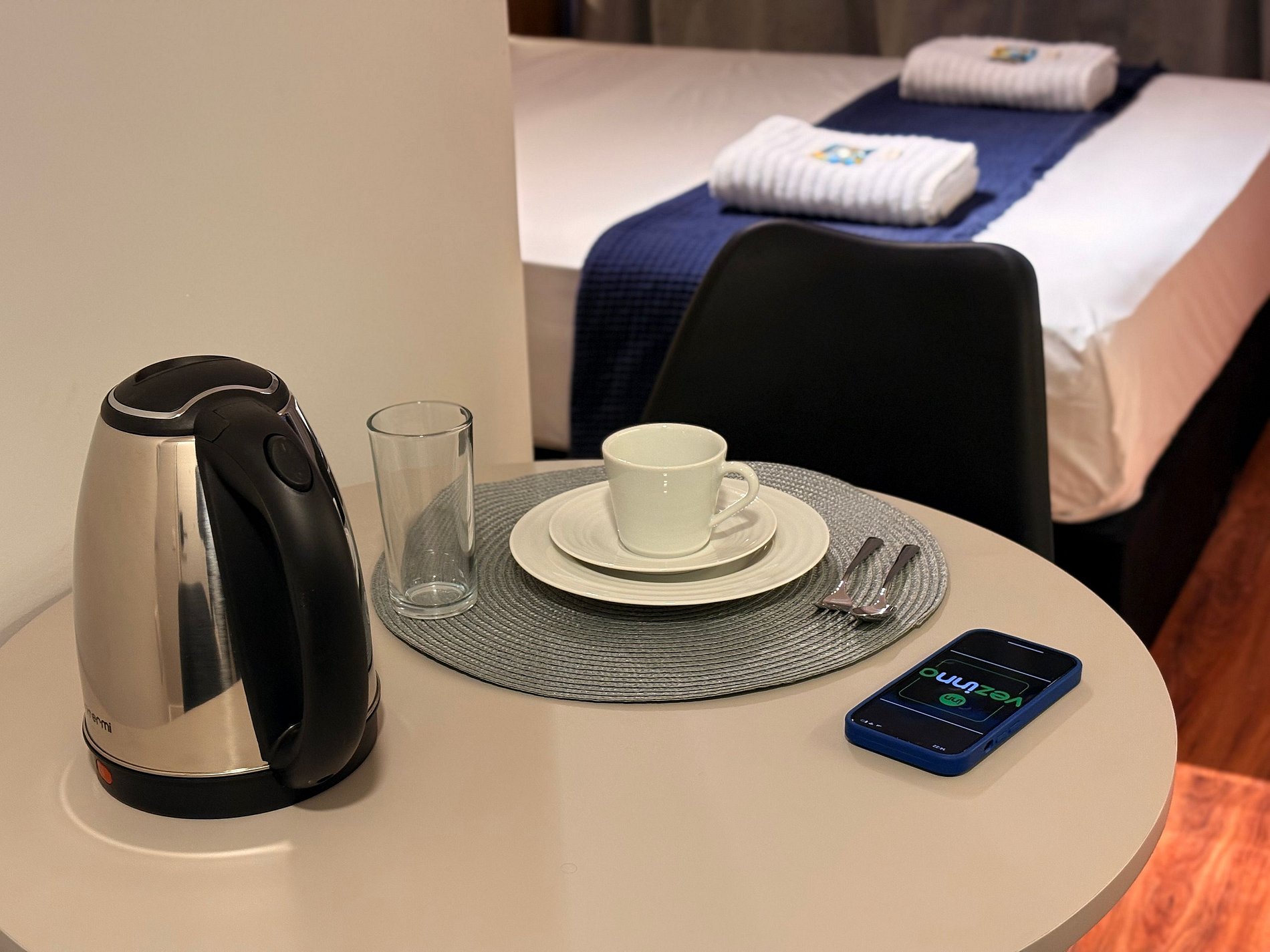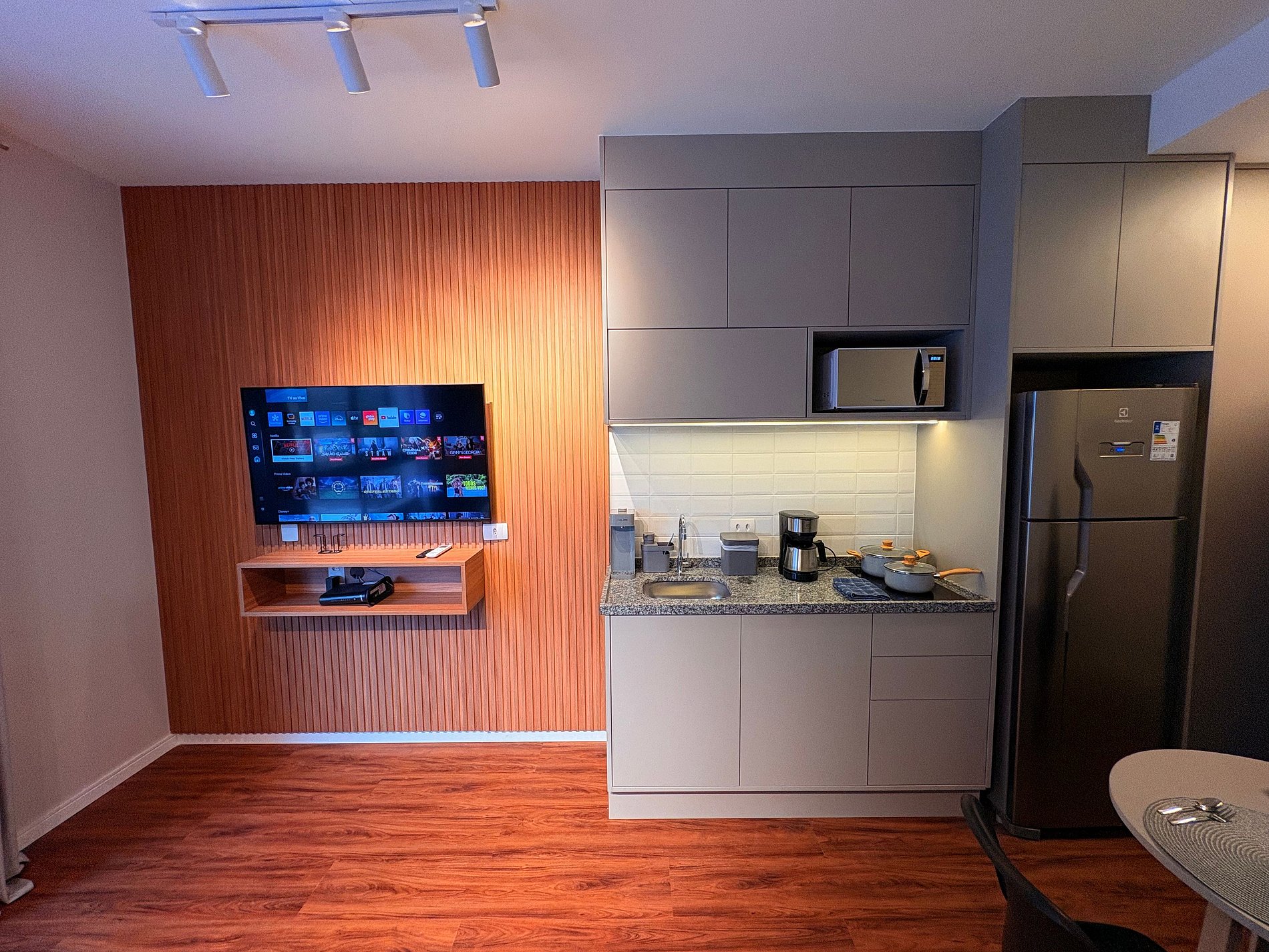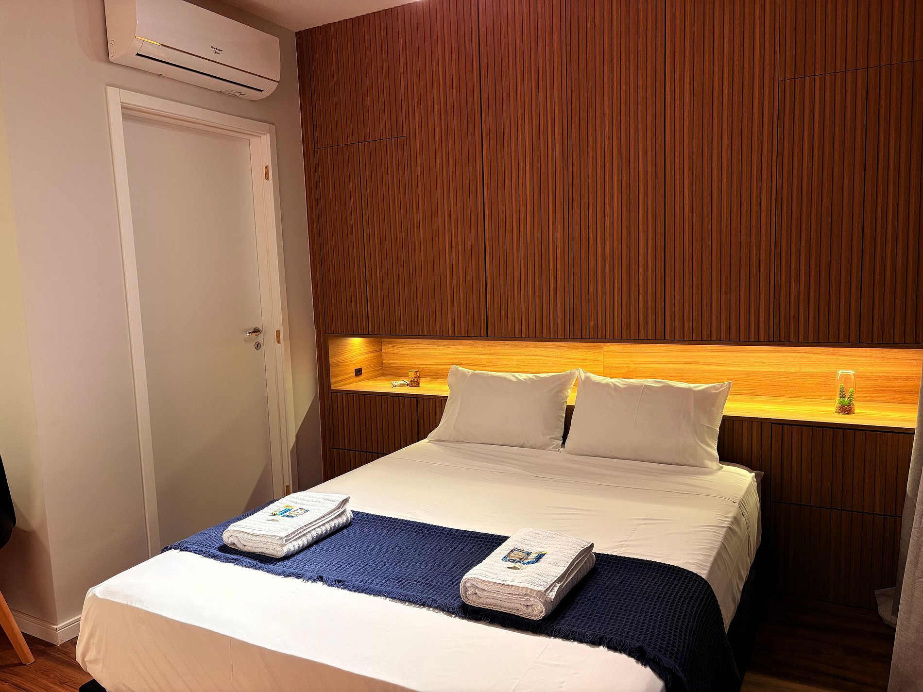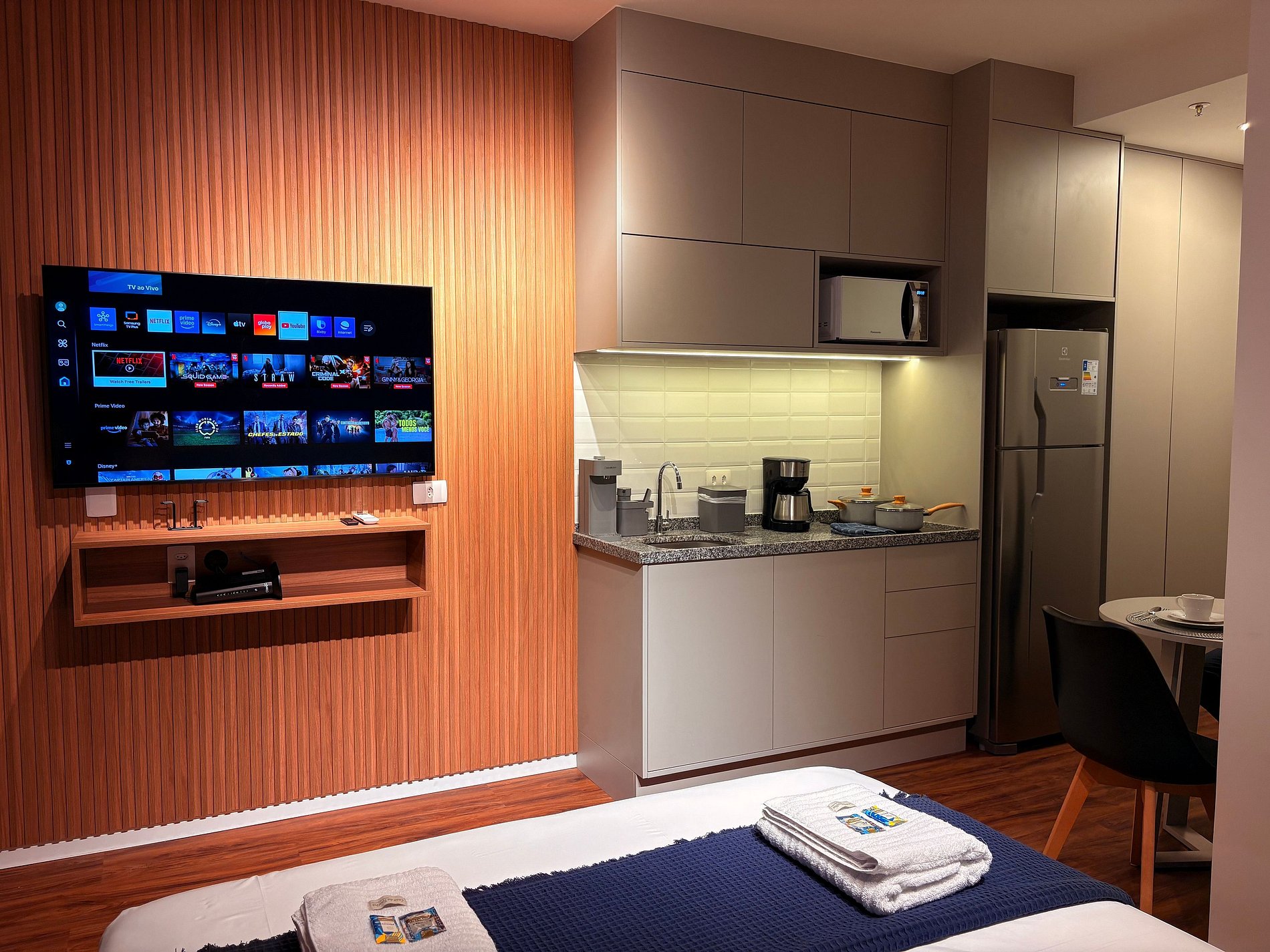O studio é equipado com cama queen, ar-condicionado, internet, televisão smart e janela com cortinas blackout. Para maior comodidade, oferecemos um enxoval completo por estadia, incluindo:2 travesseiros, 2 toalhas de banho, 1 toalha de rosto, 1 tapete de piso, 1 lençol com elástico, 1 lençol sem elástico, 2 fronhas e 1 edredom ou coberdrom. Também disponibilizamos 2 amenities por hóspede.