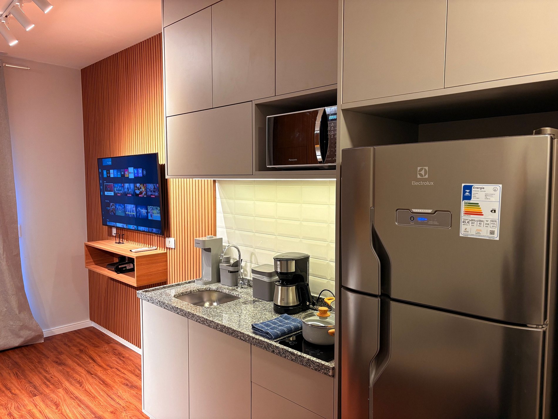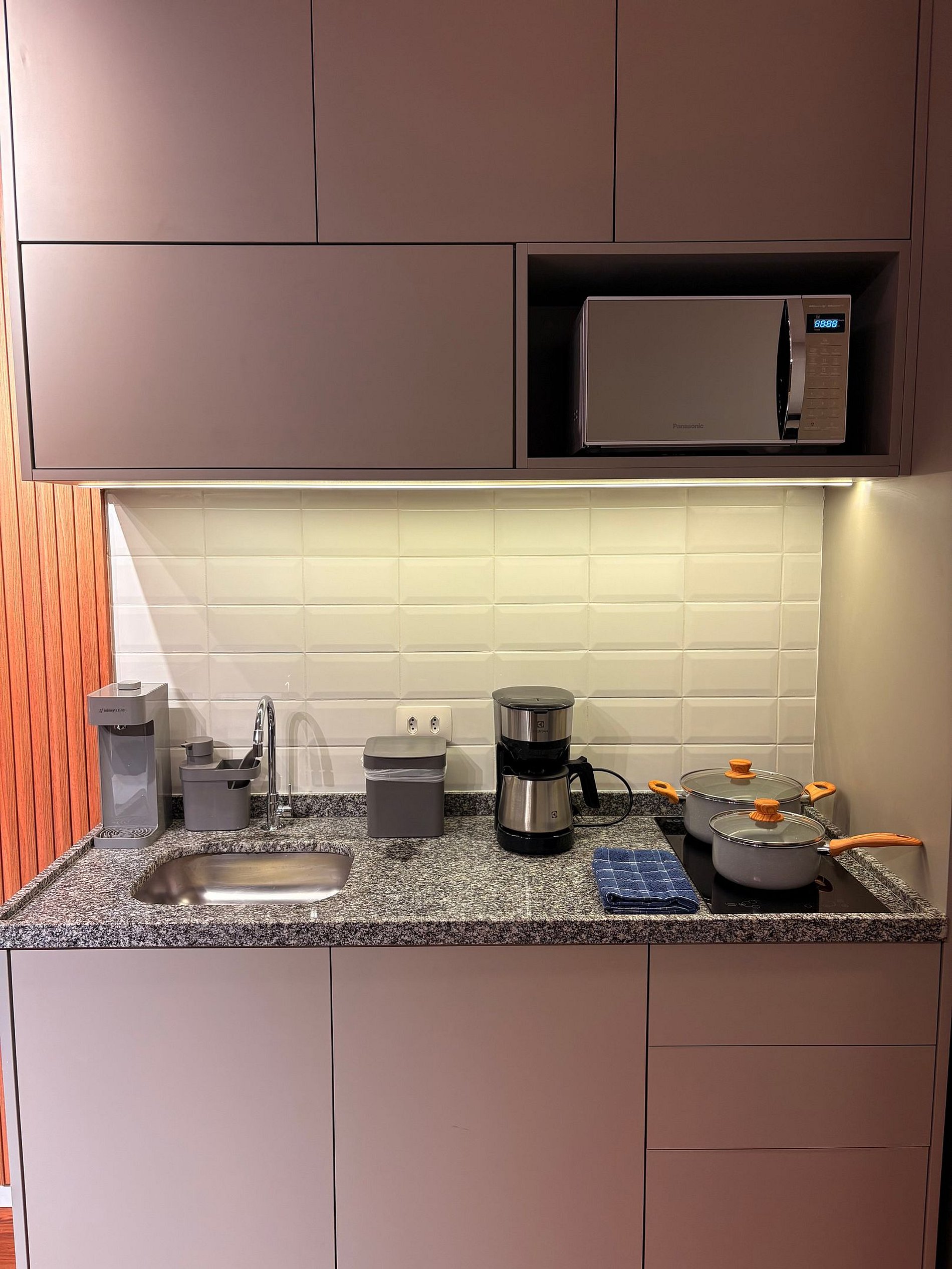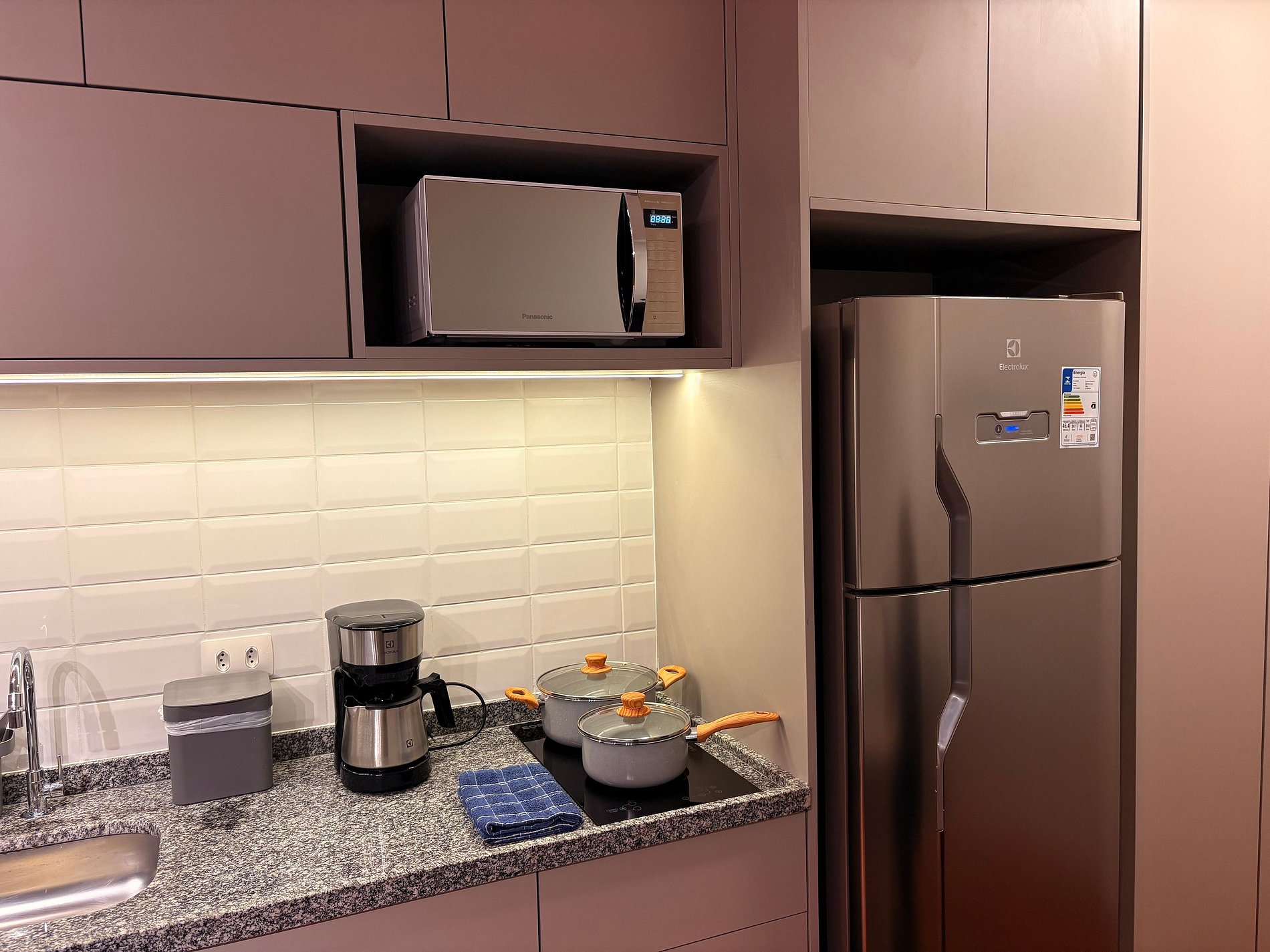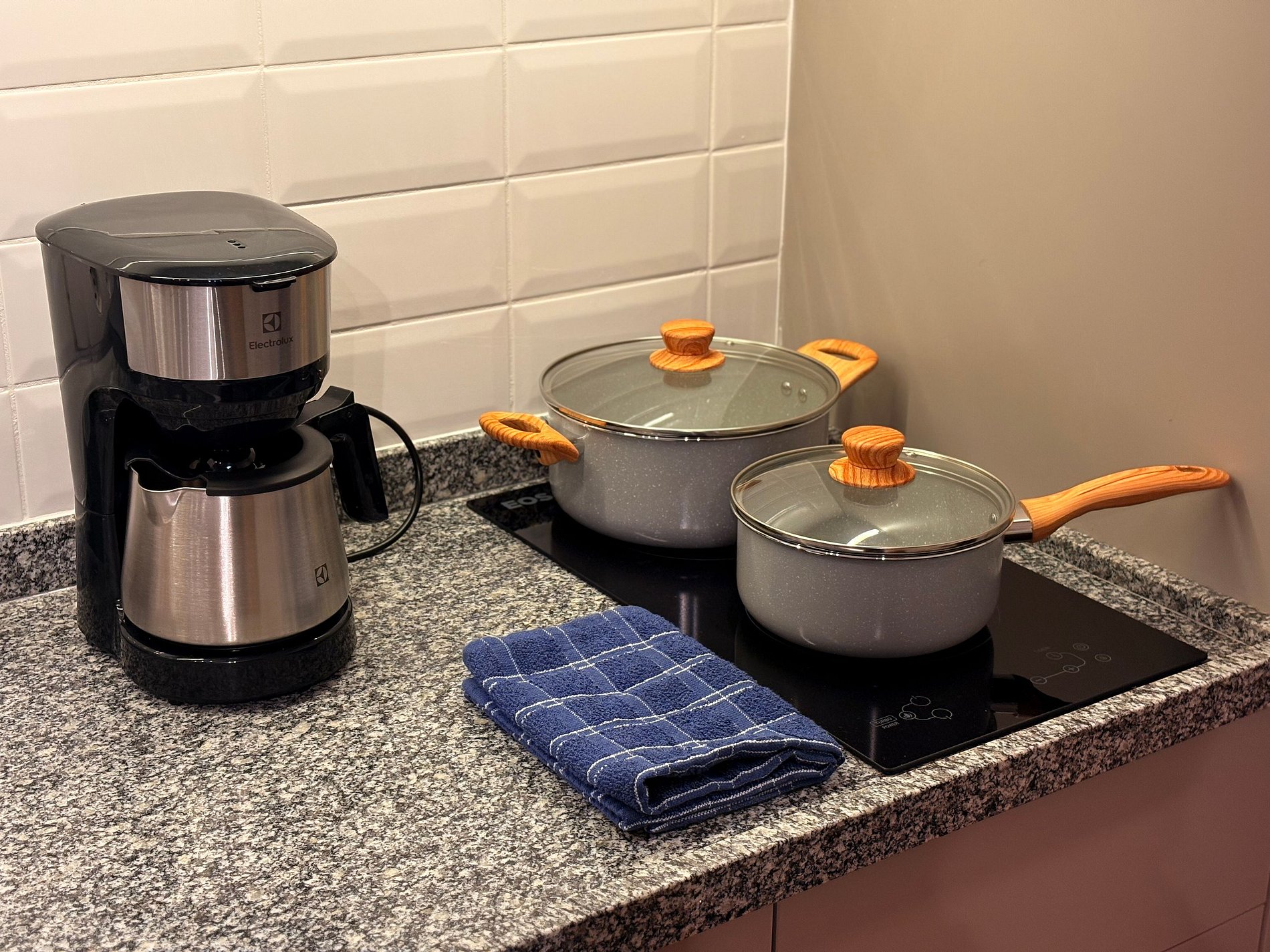 A cozinha está totalmente equipada com utensílios essenciais, como panelas, talheres, pratos, copos, sanduicheira, cafeteira elétrica, cafeteira nespresso essenza mini, chaleira e cooktop de indução. Tudo o que você precisa para preparar suas refeições com praticidade!