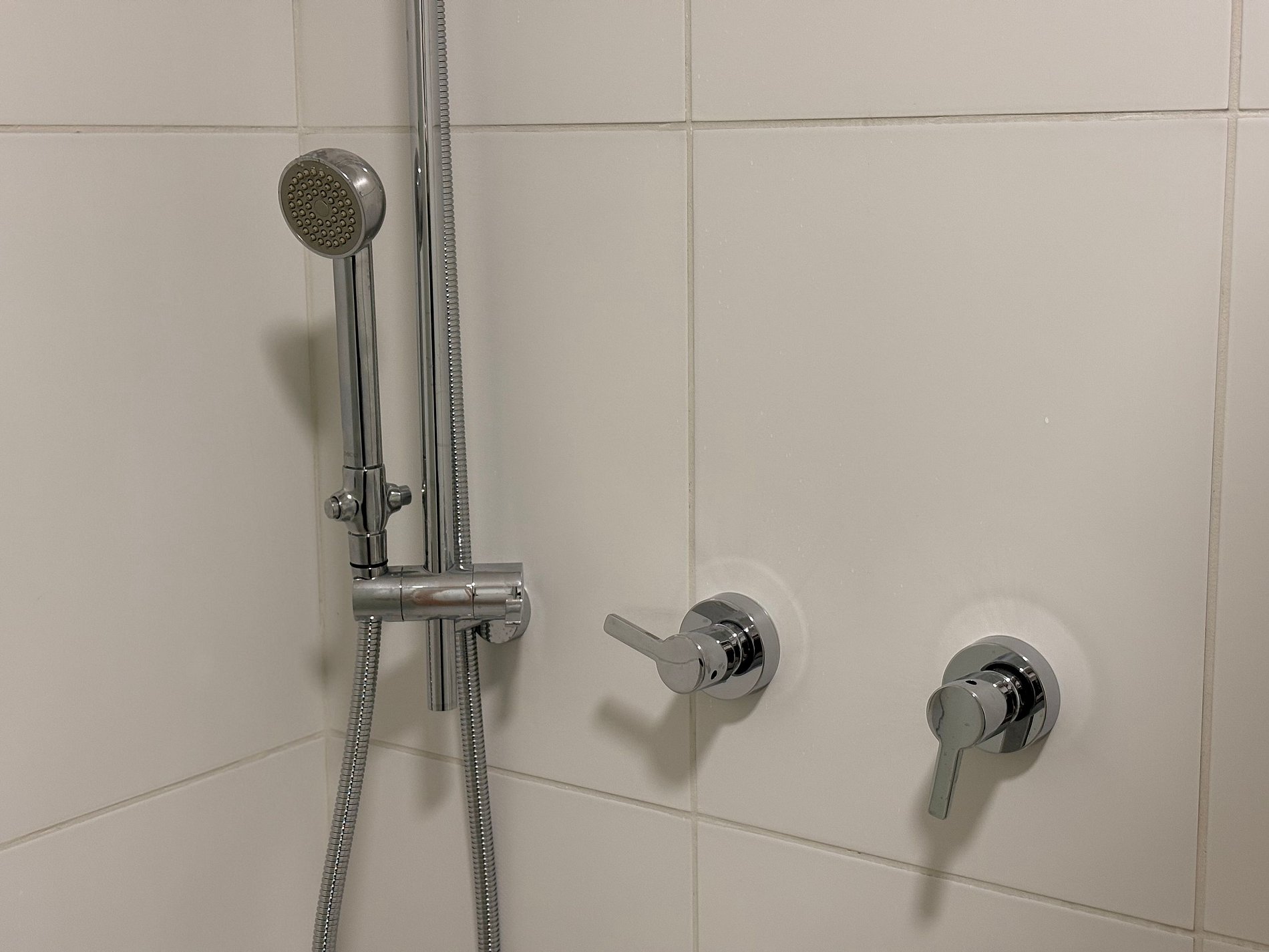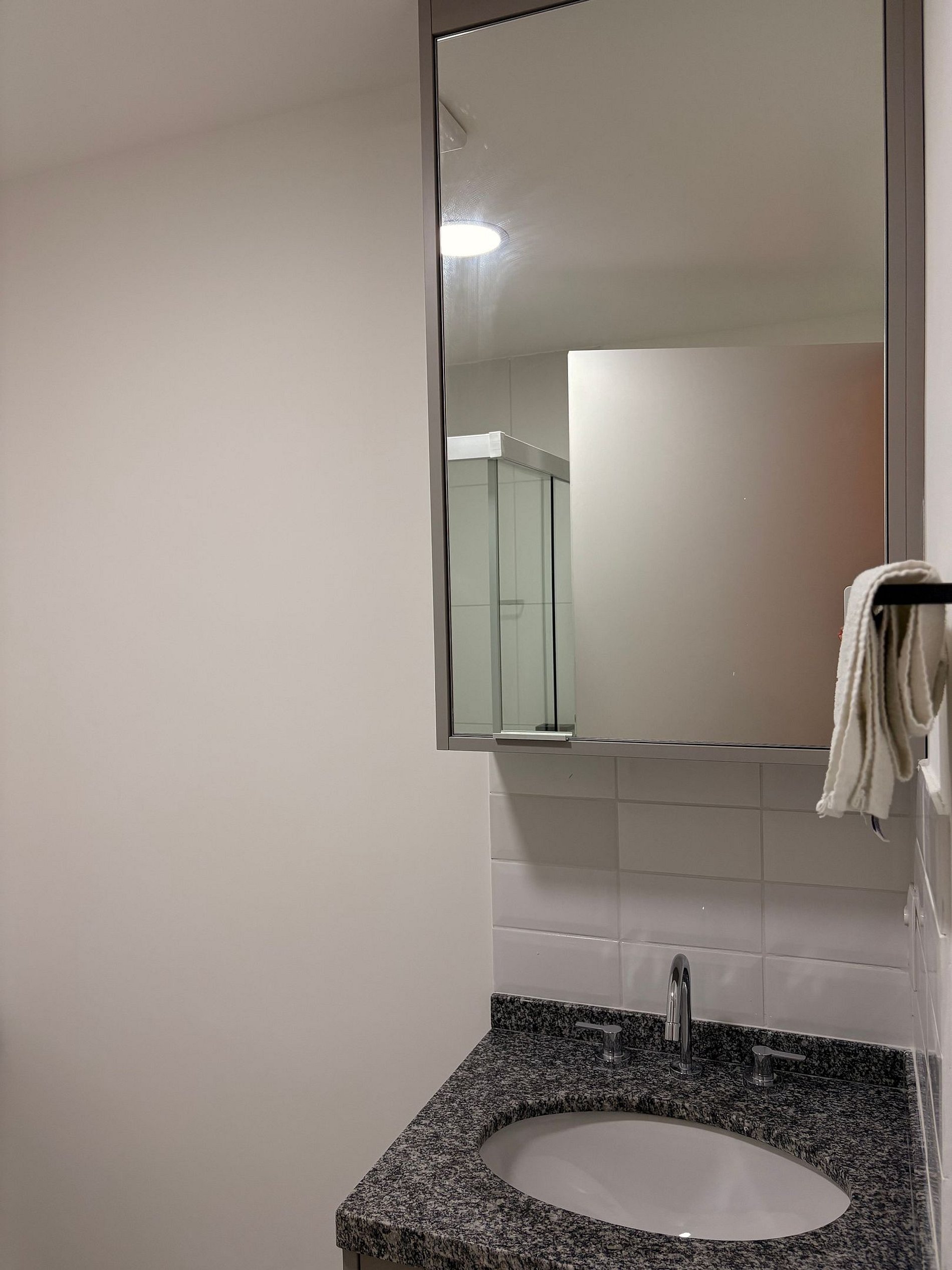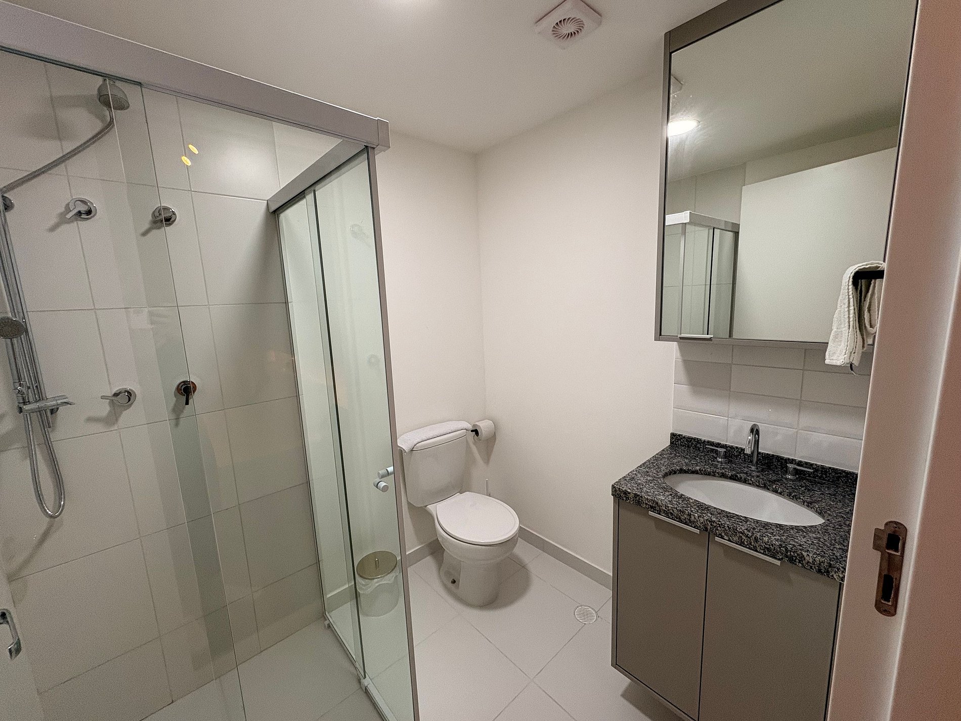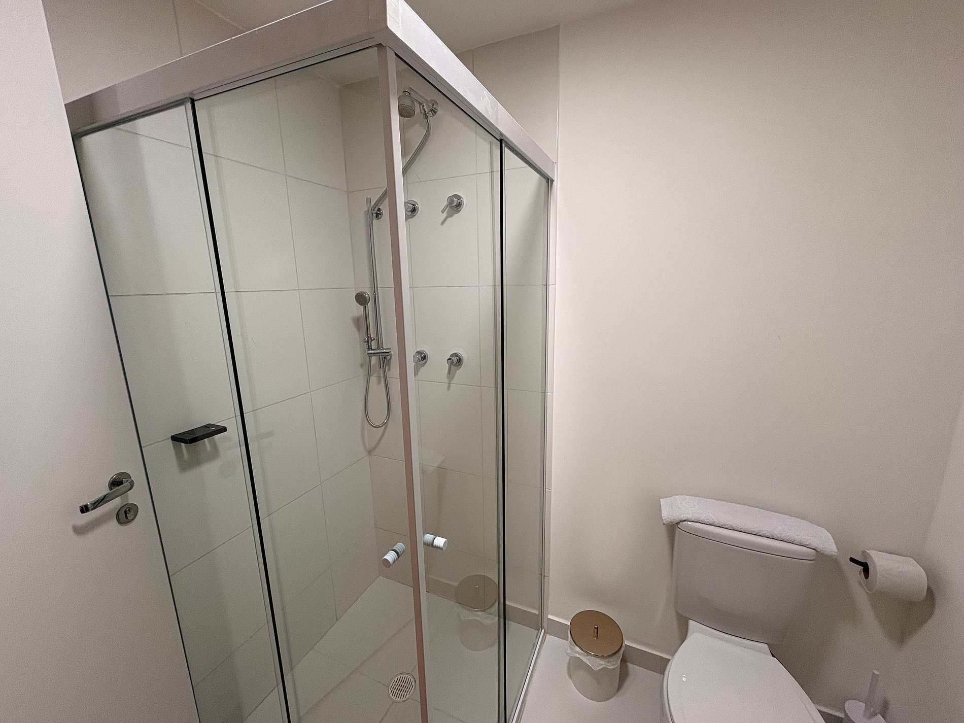 O banheiro é amplo e bem espaçoso. Para maior conveniência durante a estadia, o apartamento também oferece secador de cabelo e ferro de passar roupas.