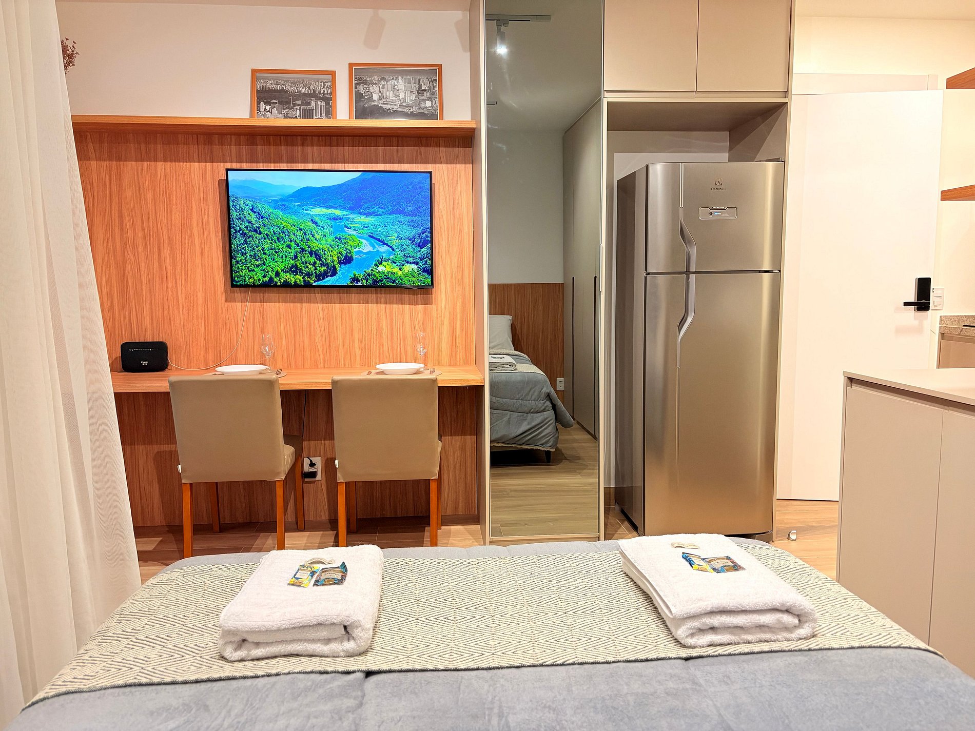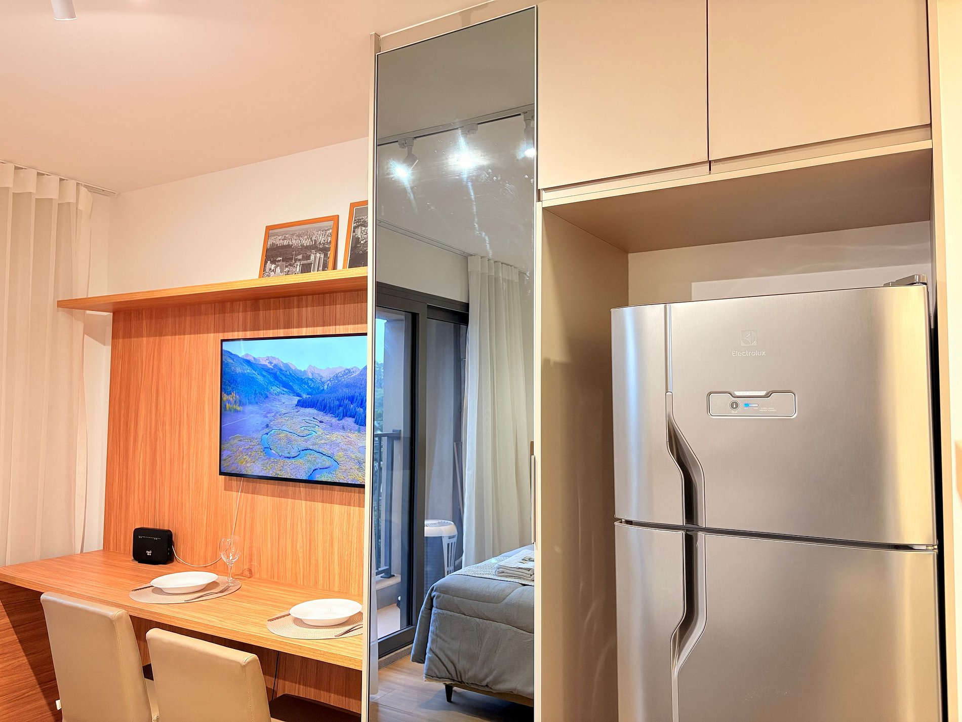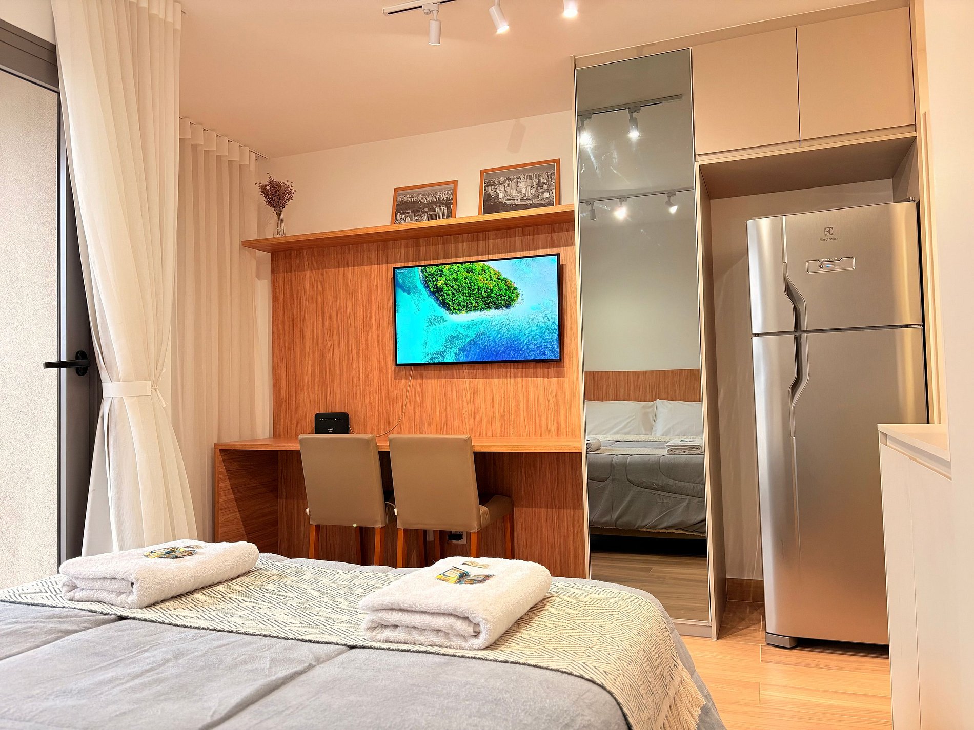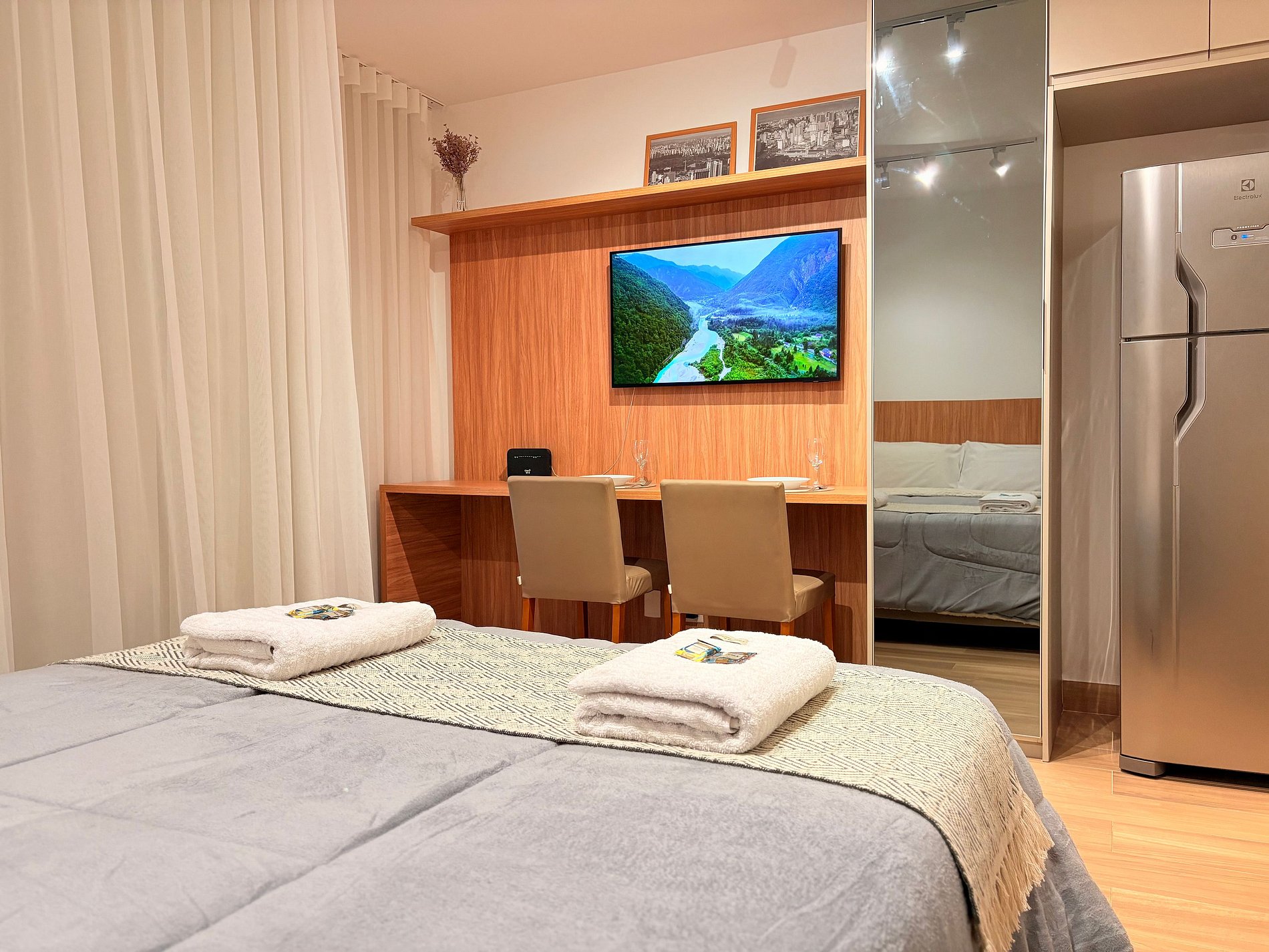 Conta com uma cama confortável, geladeira, cozinha equipada, TV Smart, área de refeições ou trabalho e outras comodidades. Perfeito para viagens a trabalho ou lazer!