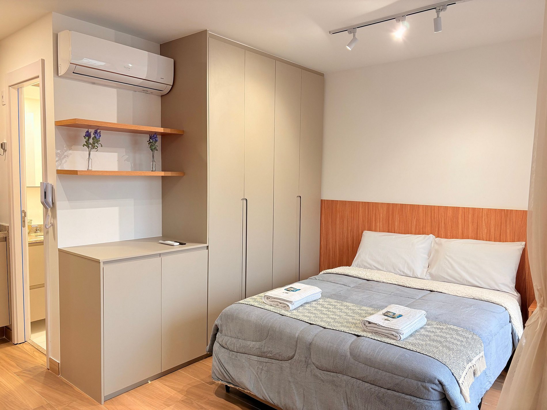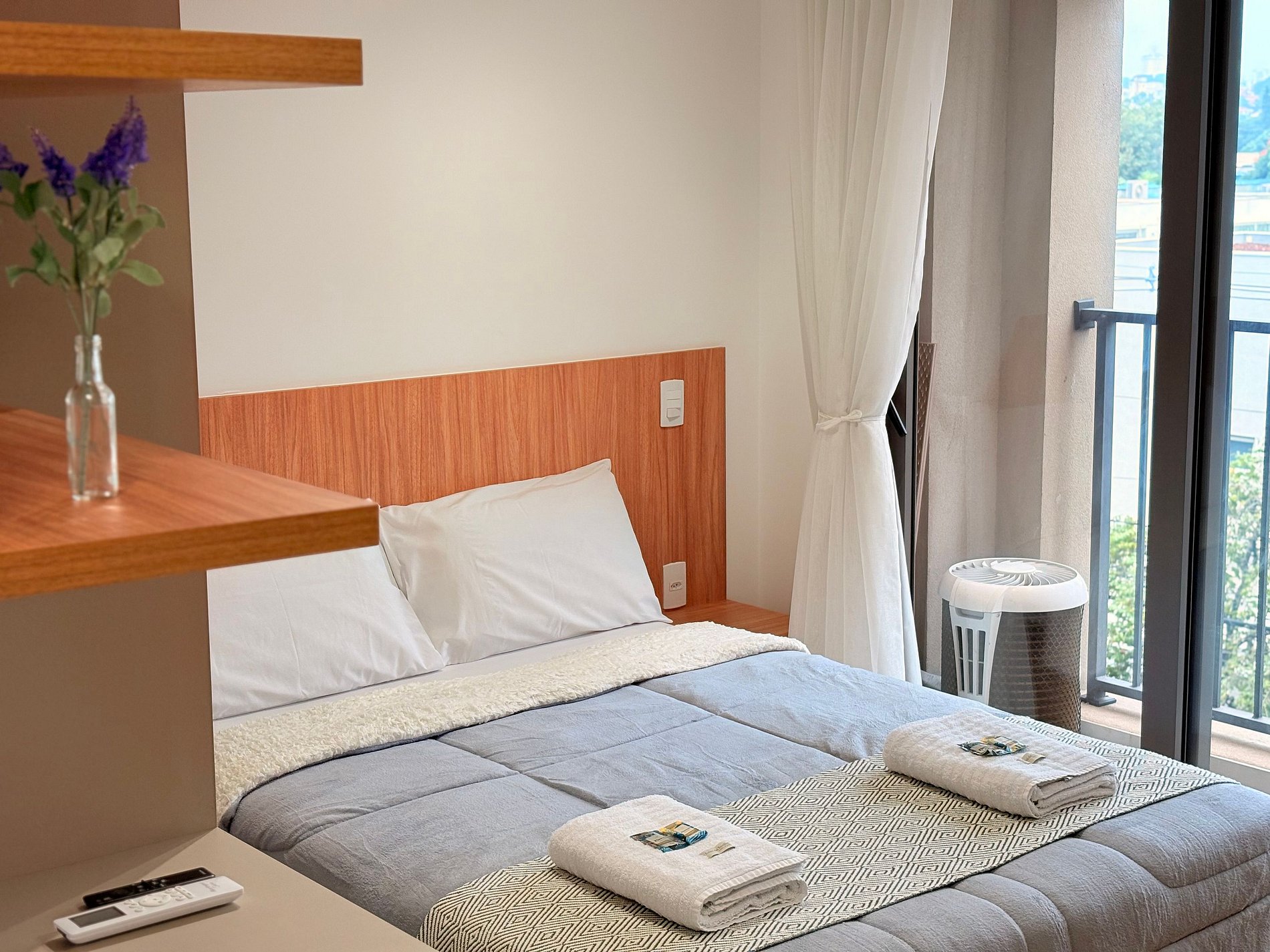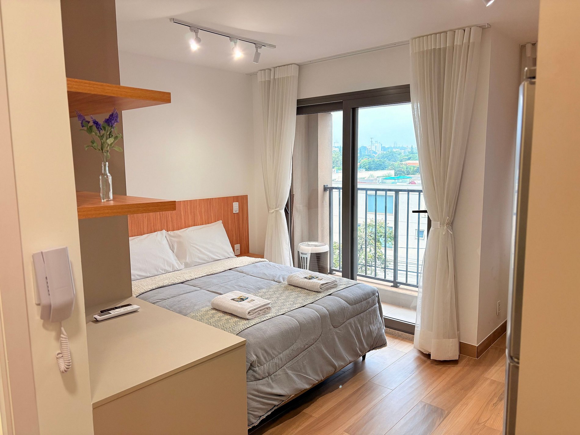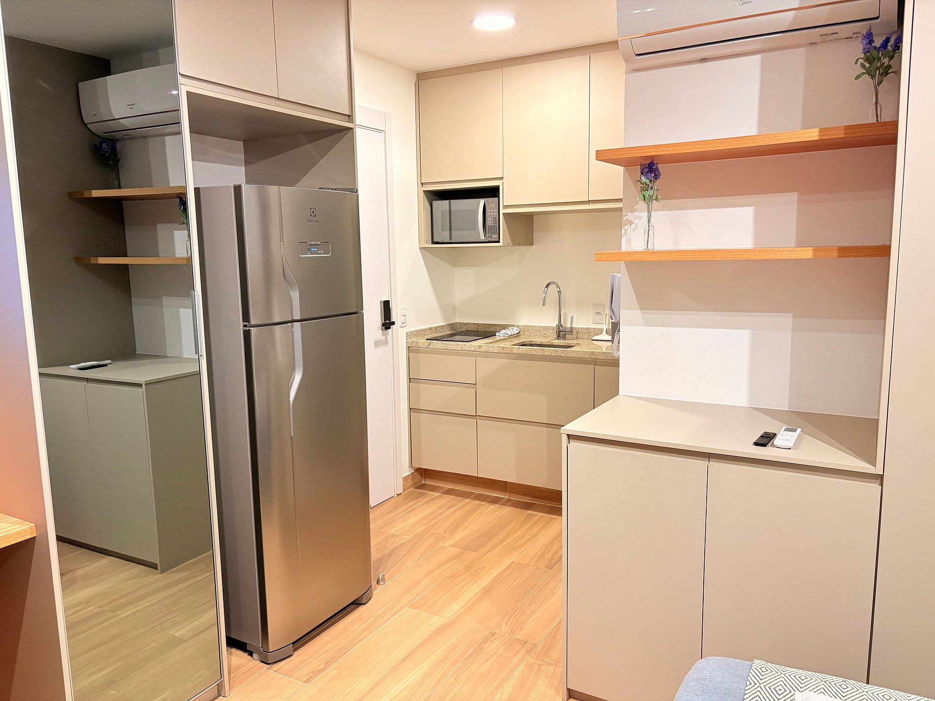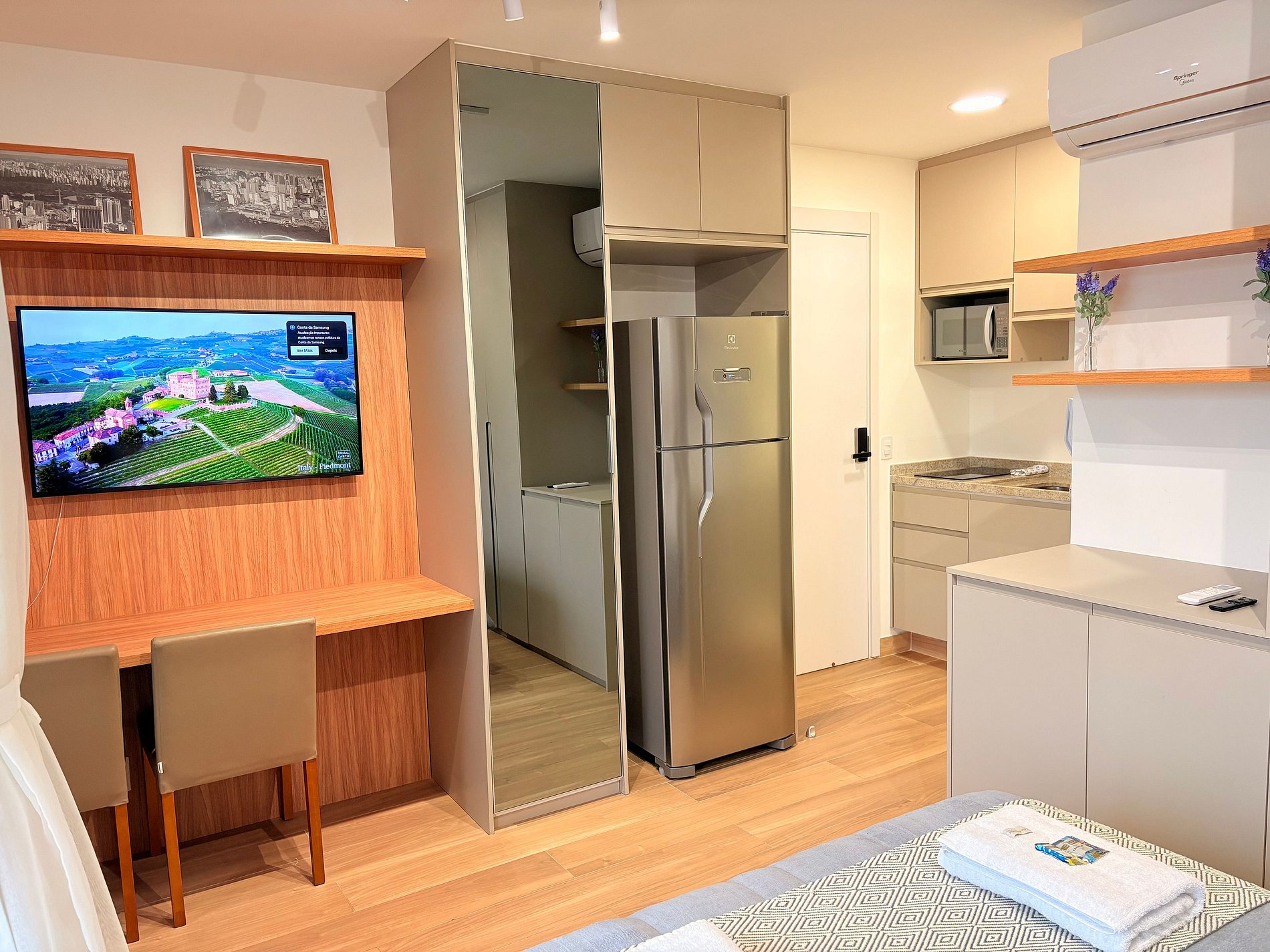 Conta com uma cama confortável, geladeira, cozinha equipada, TV Smart, área de refeições ou trabalho e outras comodidades. Perfeito para viagens a trabalho ou lazer!