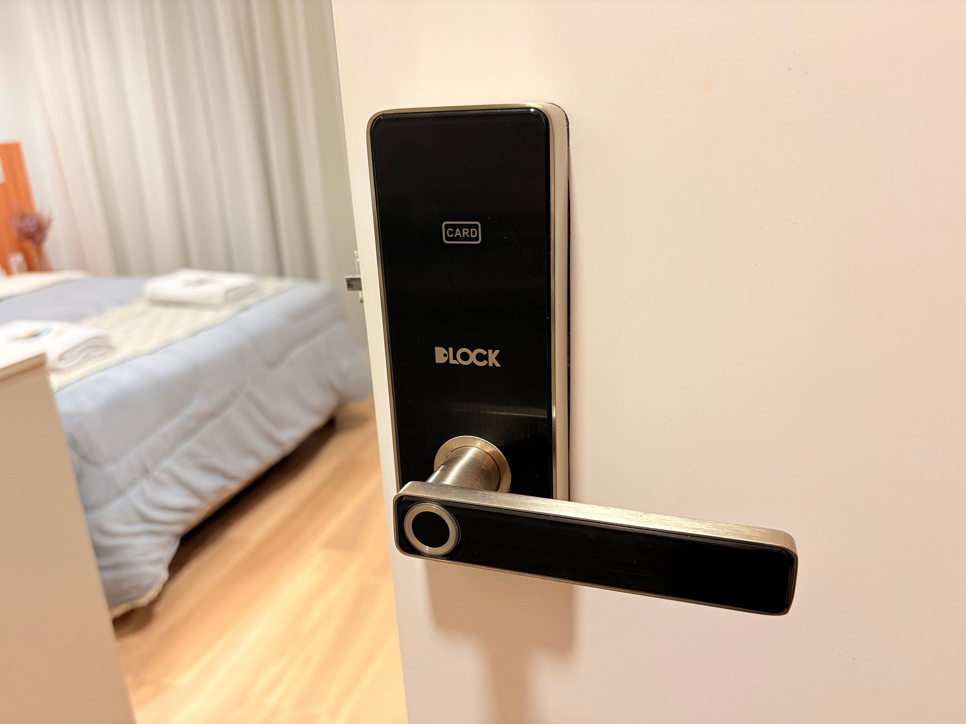 O acesso ao apartamento é feito de forma prática e segura através de uma fechadura inteligente.