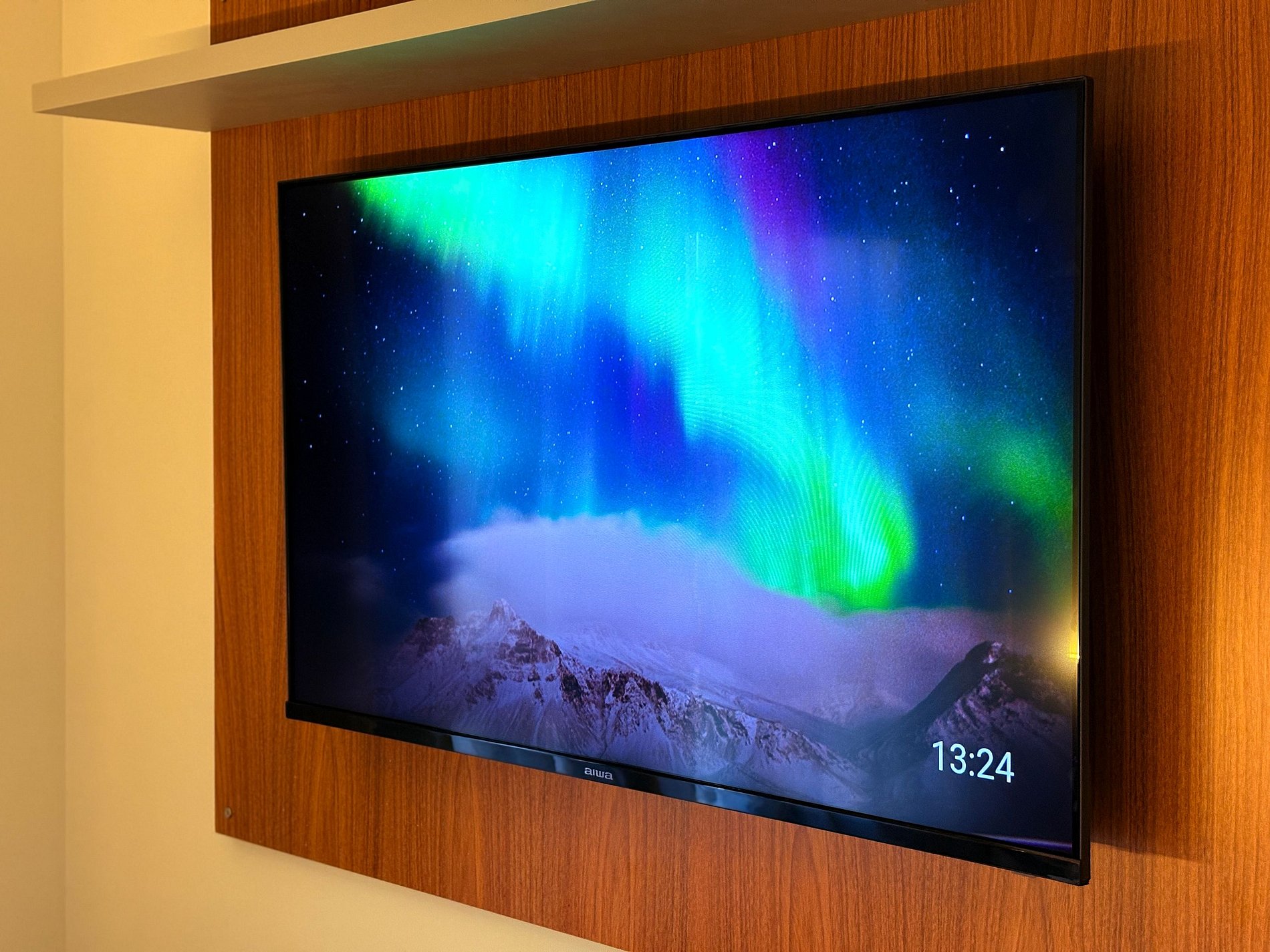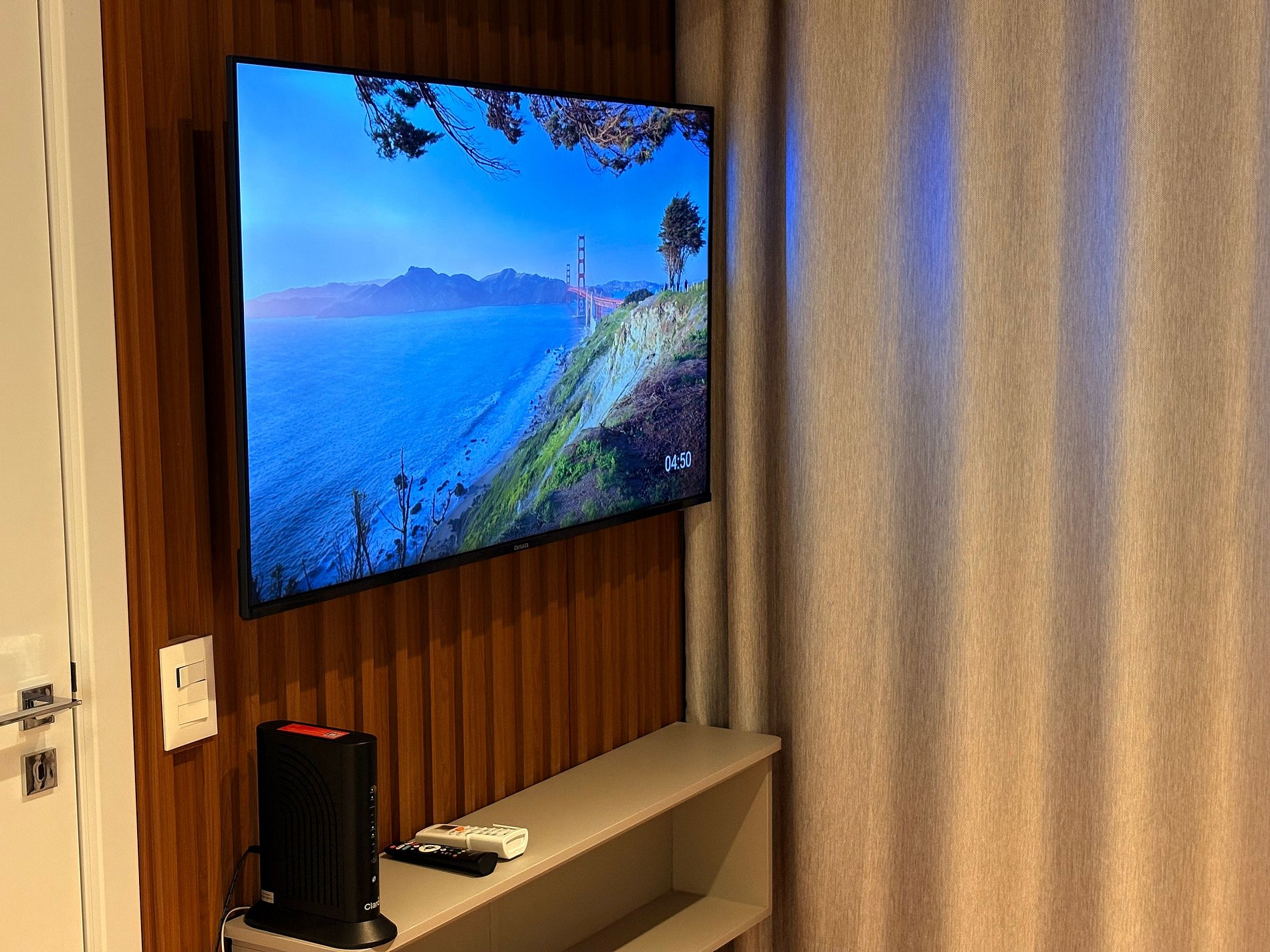 A sala é aconchegante e funcional, com sofá confortável, televisão smart e acesso à internet via Wi-Fi.