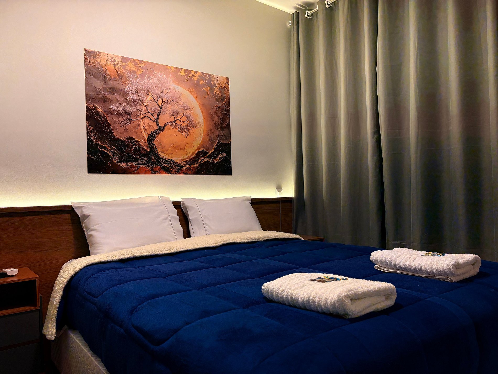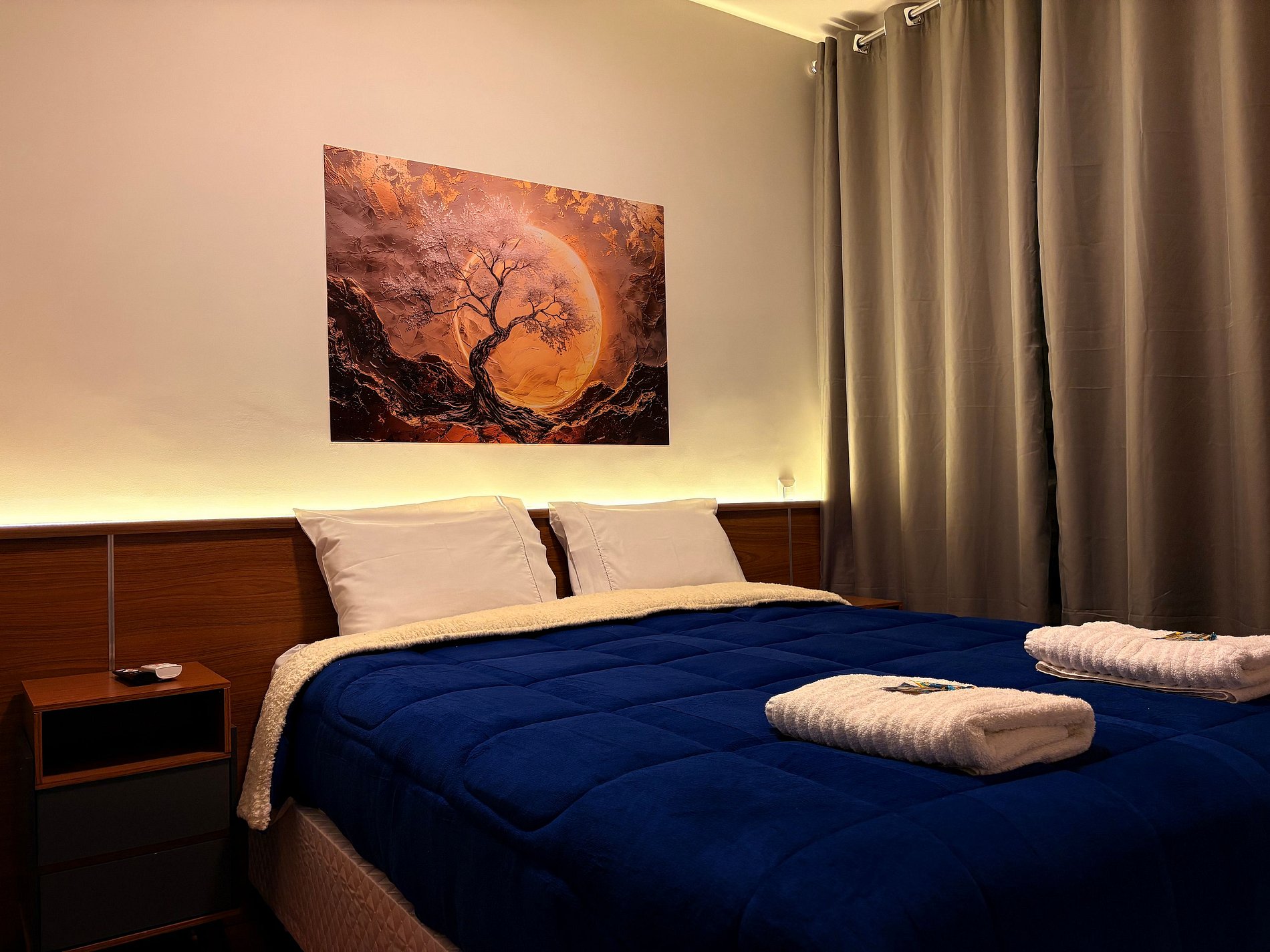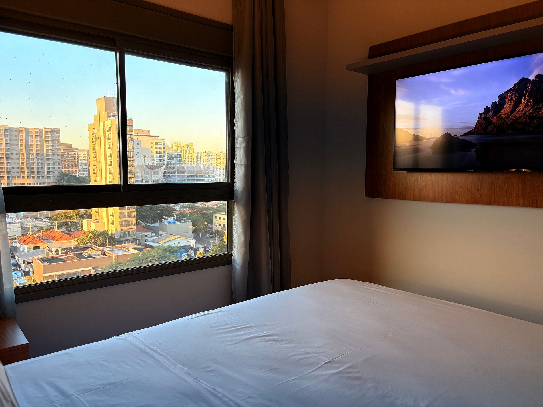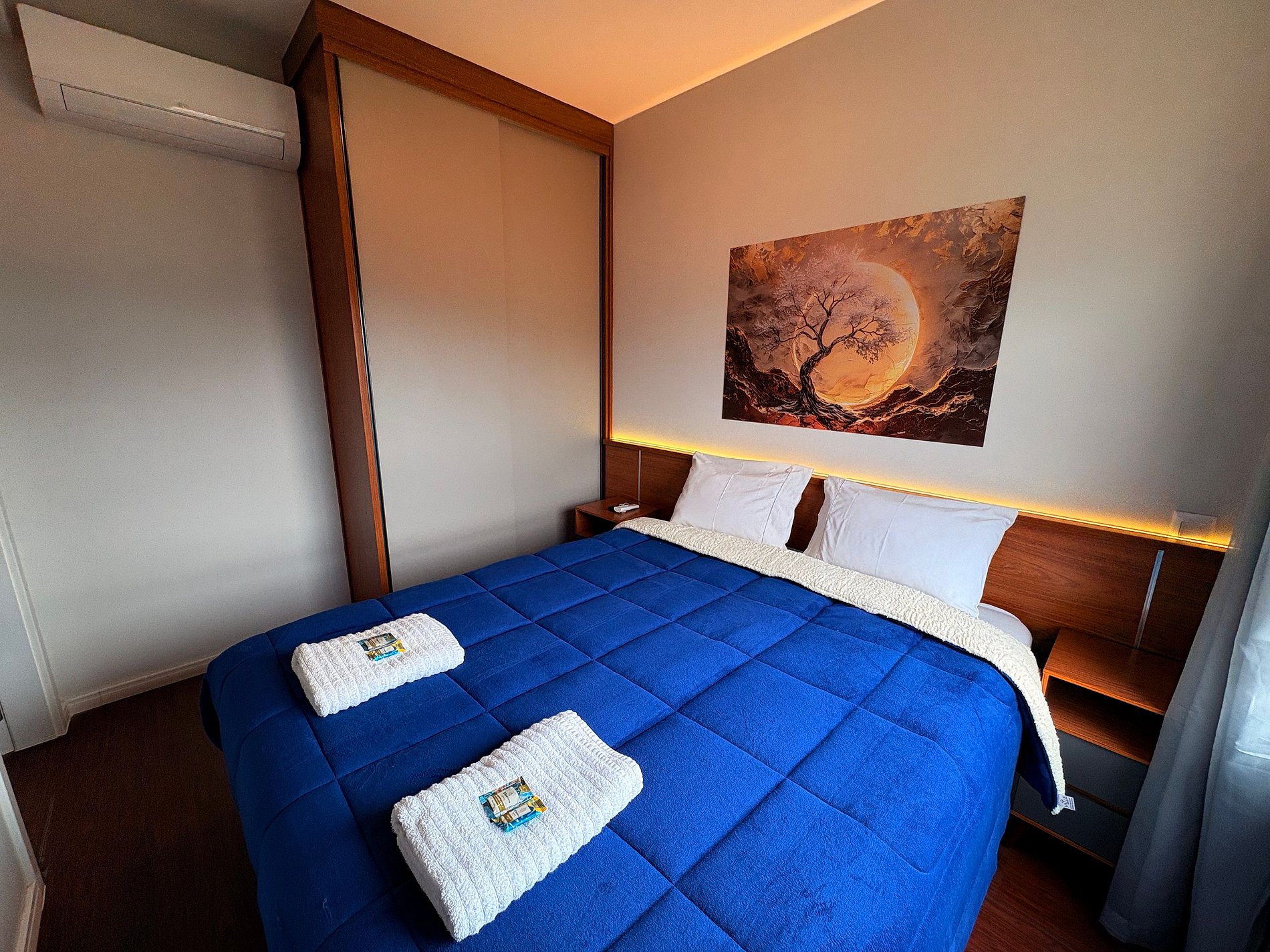 O apartamento fica no 10° andar, conta com um dormitório equipado com cama queen, ar-condicionado, televisão smart e janela com sistema blackout. Para maior comodidade, oferecemos um jogo de enxoval por estadia, incluindo: 2 toalhas de banho, 1 toalha de rosto, 1 tapete de piso, 1 lençol com elástico, 1 lençol sem elástico, 2 fronhas e 1 edredom ou manta. Também disponibilizamos 2 amenities por hóspede.