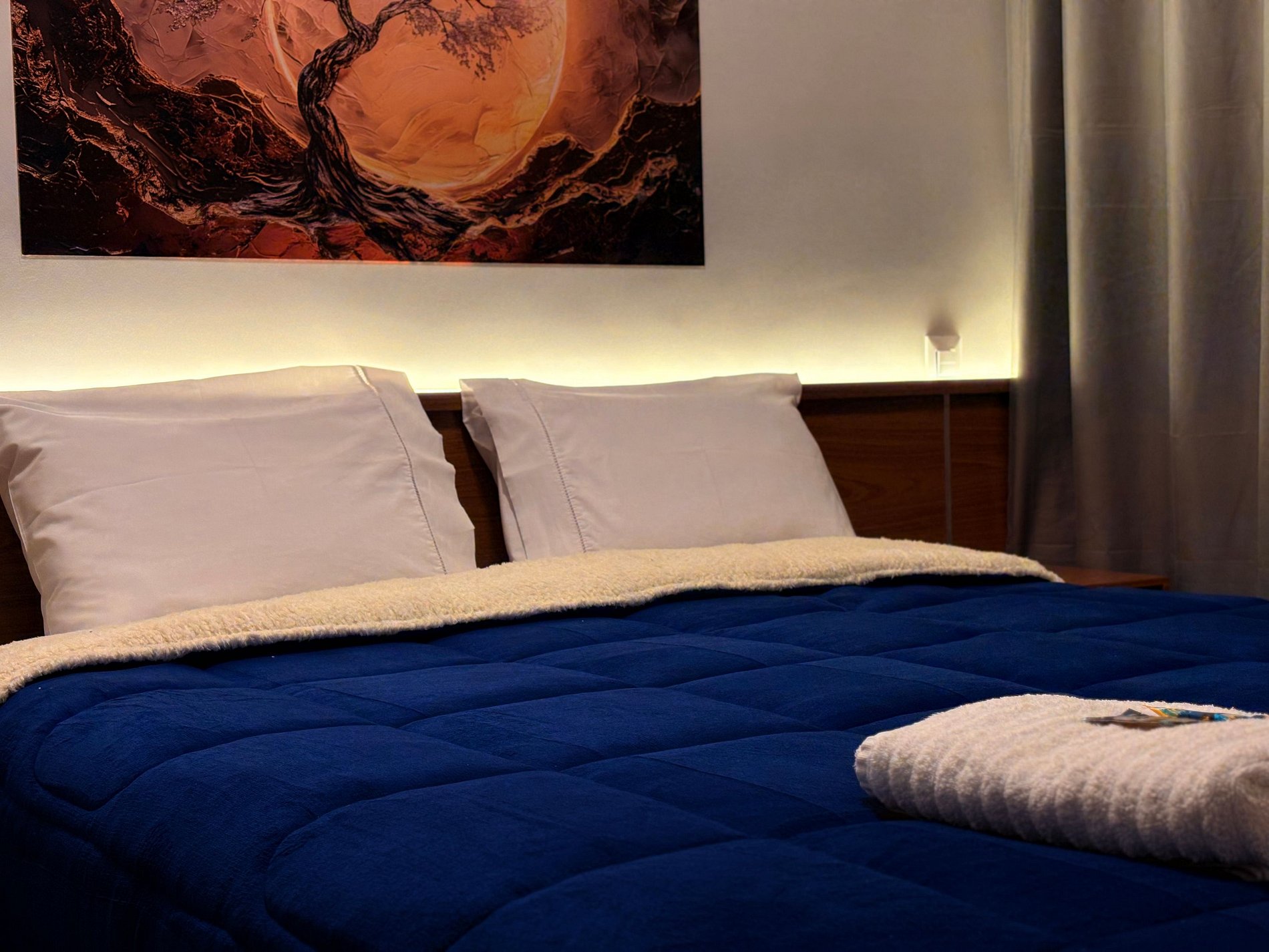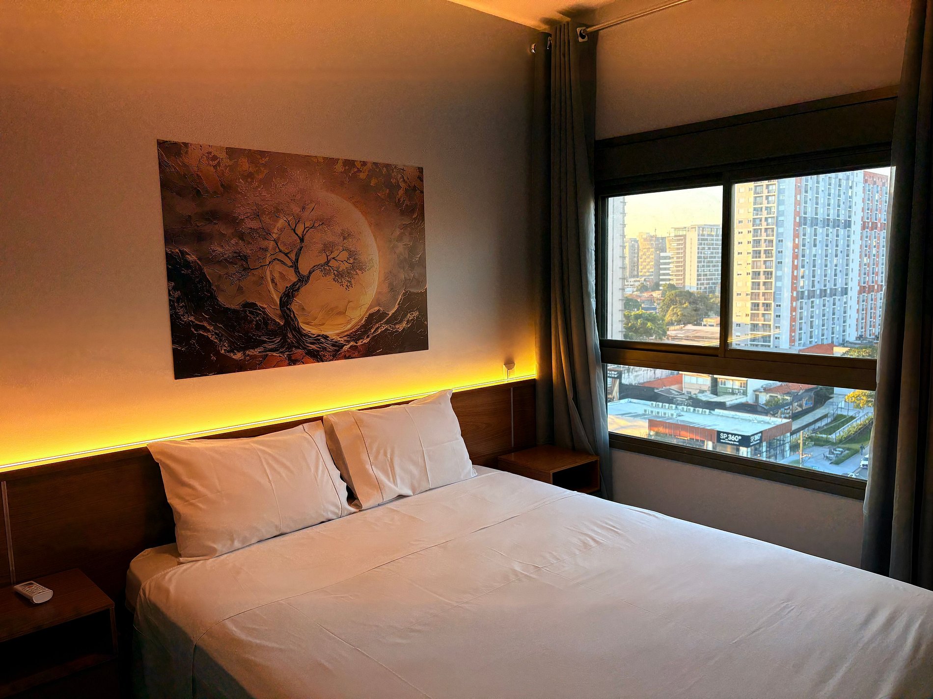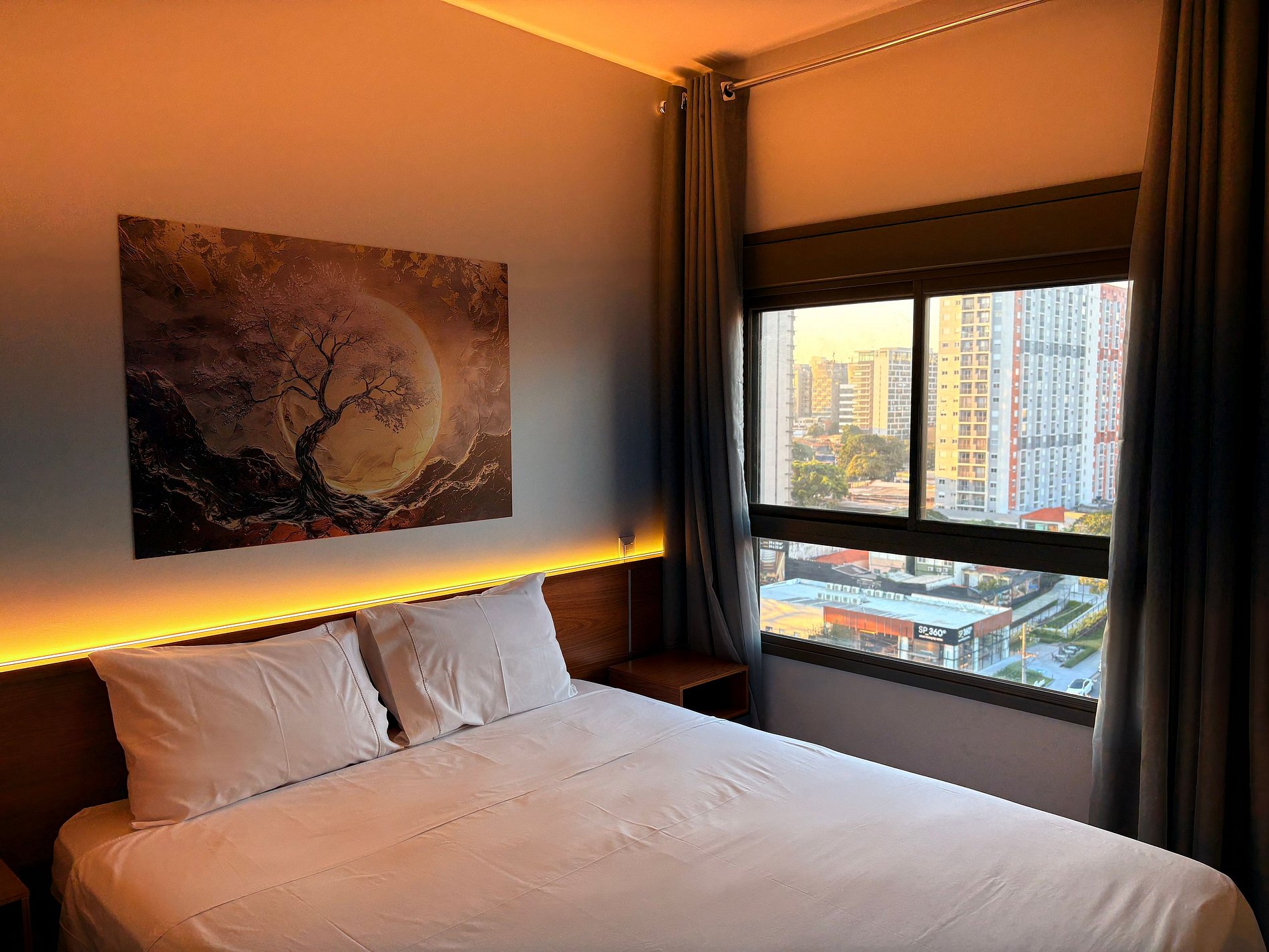 O apartamento fica no 10° andar, conta com um dormitório equipado com cama queen, ar-condicionado, televisão smart e janela com sistema blackout. Para maior comodidade, oferecemos um jogo de enxoval por estadia, incluindo: 2 toalhas de banho, 1 toalha de rosto, 1 tapete de piso, 1 lençol com elástico, 1 lençol sem elástico, 2 fronhas e 1 edredom ou manta. Também disponibilizamos 2 amenities por hóspede.