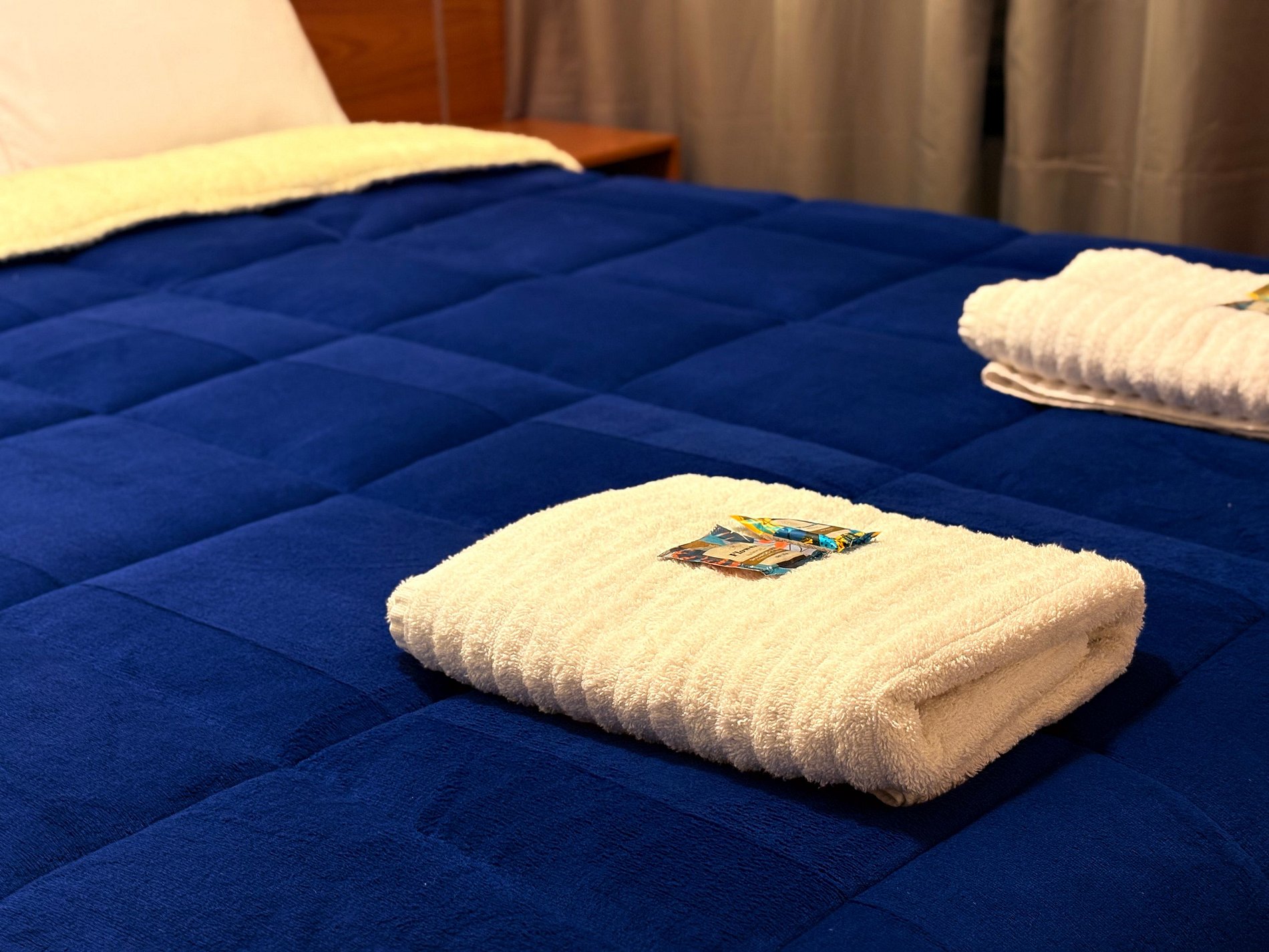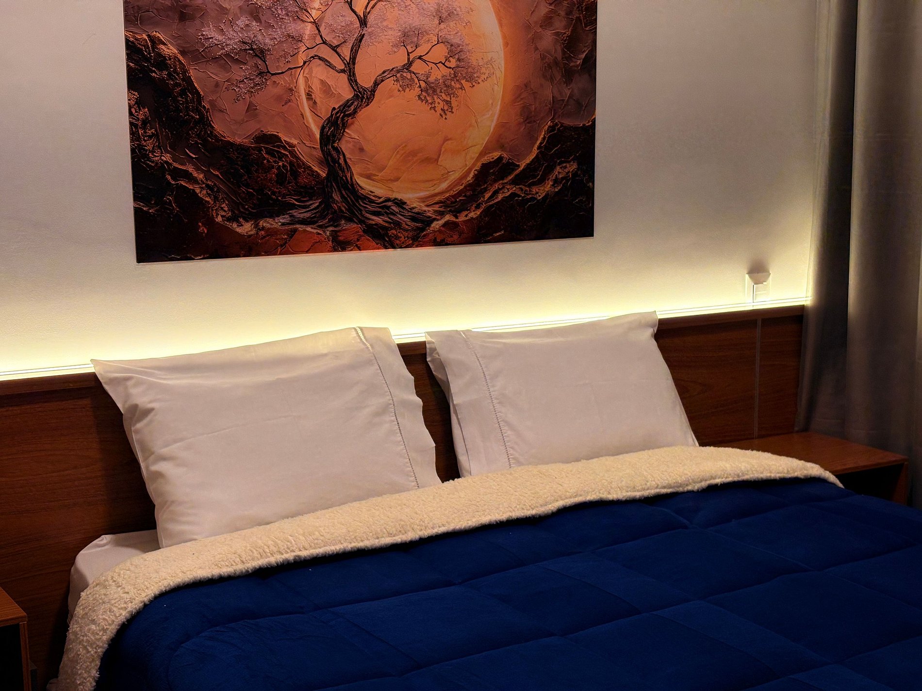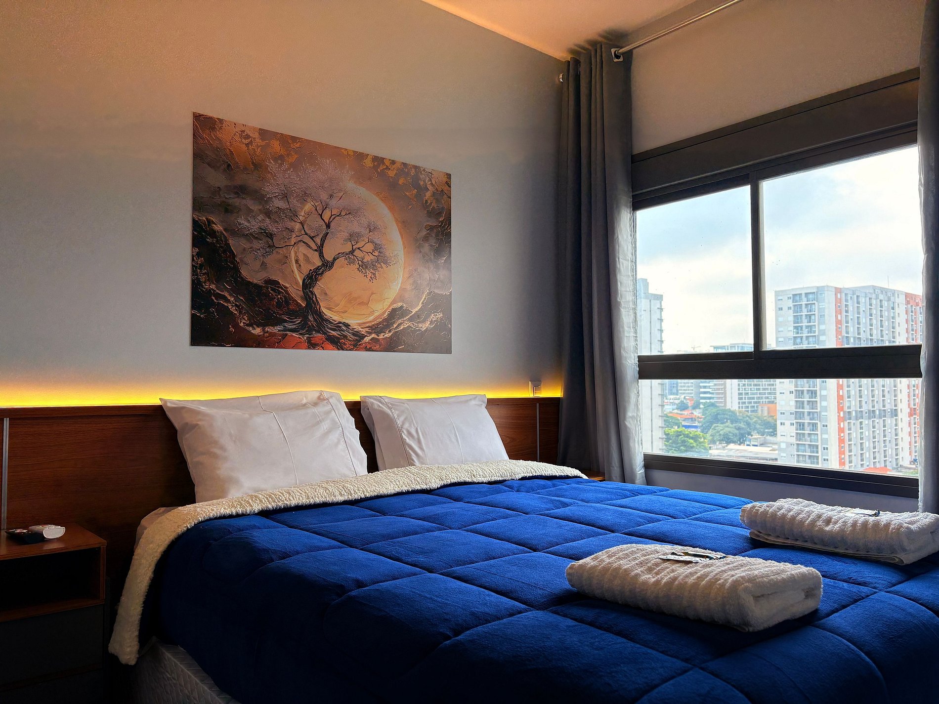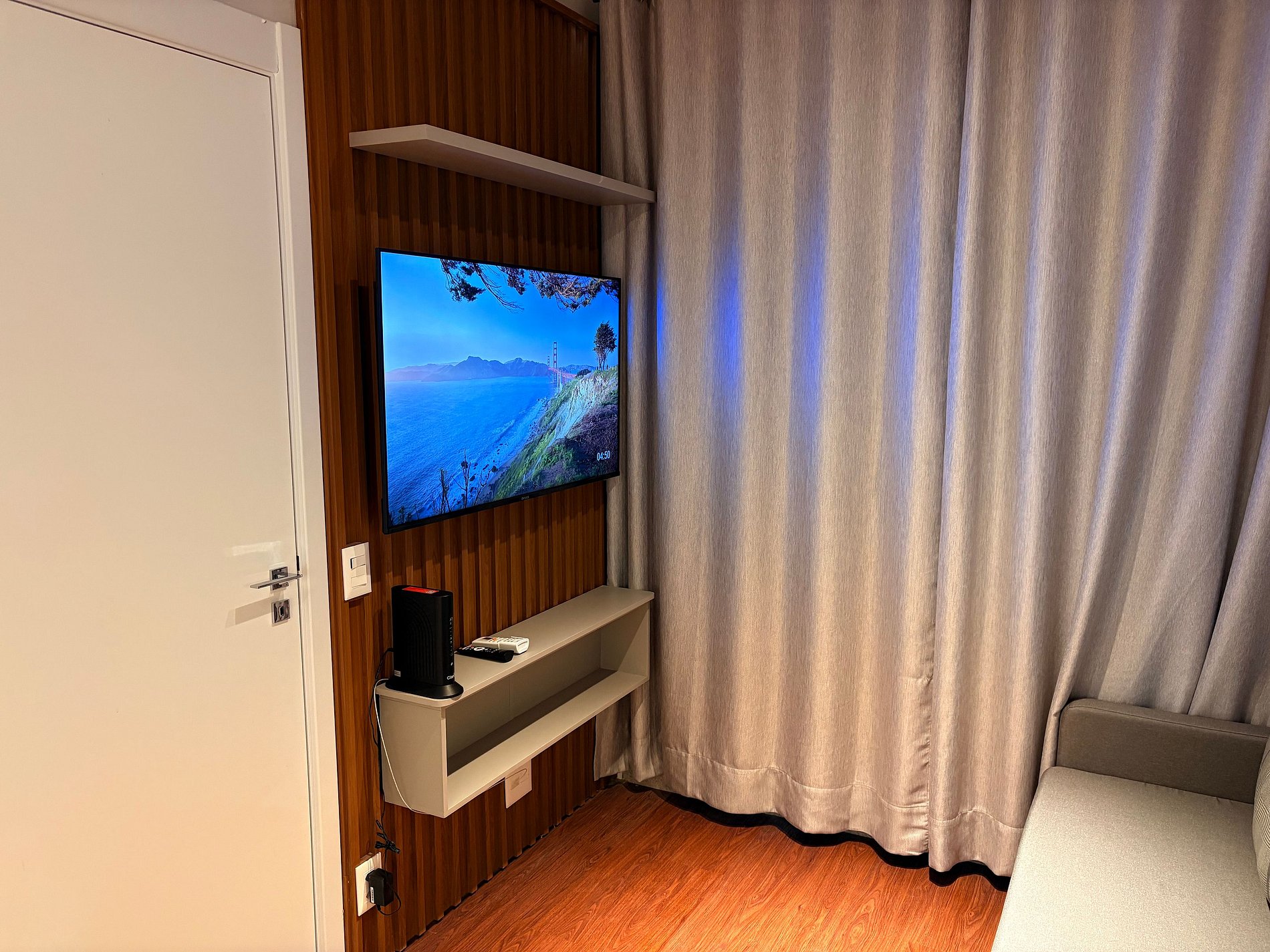 O apartamento fica no 10° andar, conta com um dormitório equipado com cama queen, ar-condicionado, televisão smart e janela com sistema blackout. Para maior comodidade, oferecemos um jogo de enxoval por estadia, incluindo: 2 toalhas de banho, 1 toalha de rosto, 1 tapete de piso, 1 lençol com elástico, 1 lençol sem elástico, 2 fronhas e 1 edredom ou manta. Também disponibilizamos 2 amenities por hóspede.