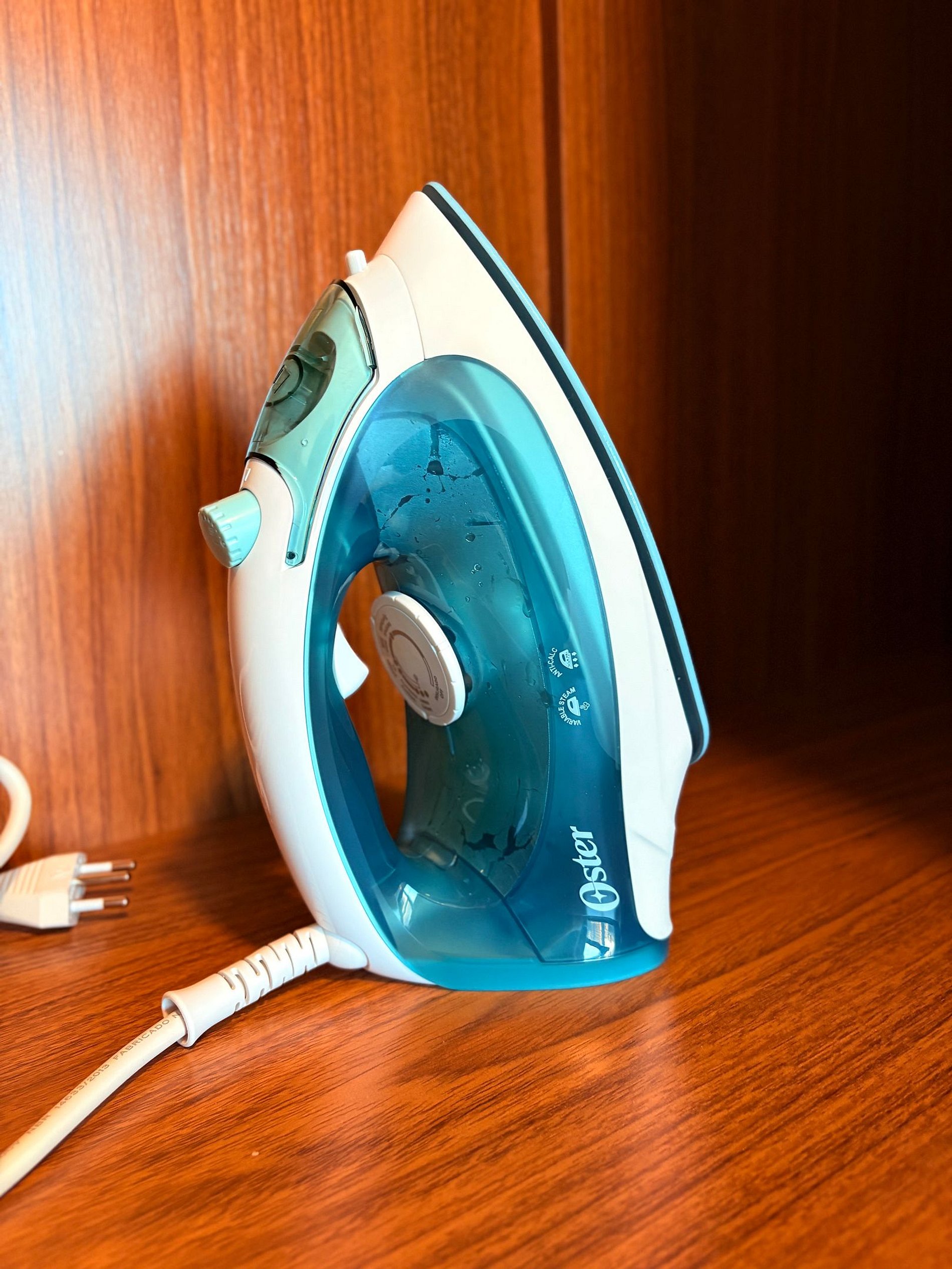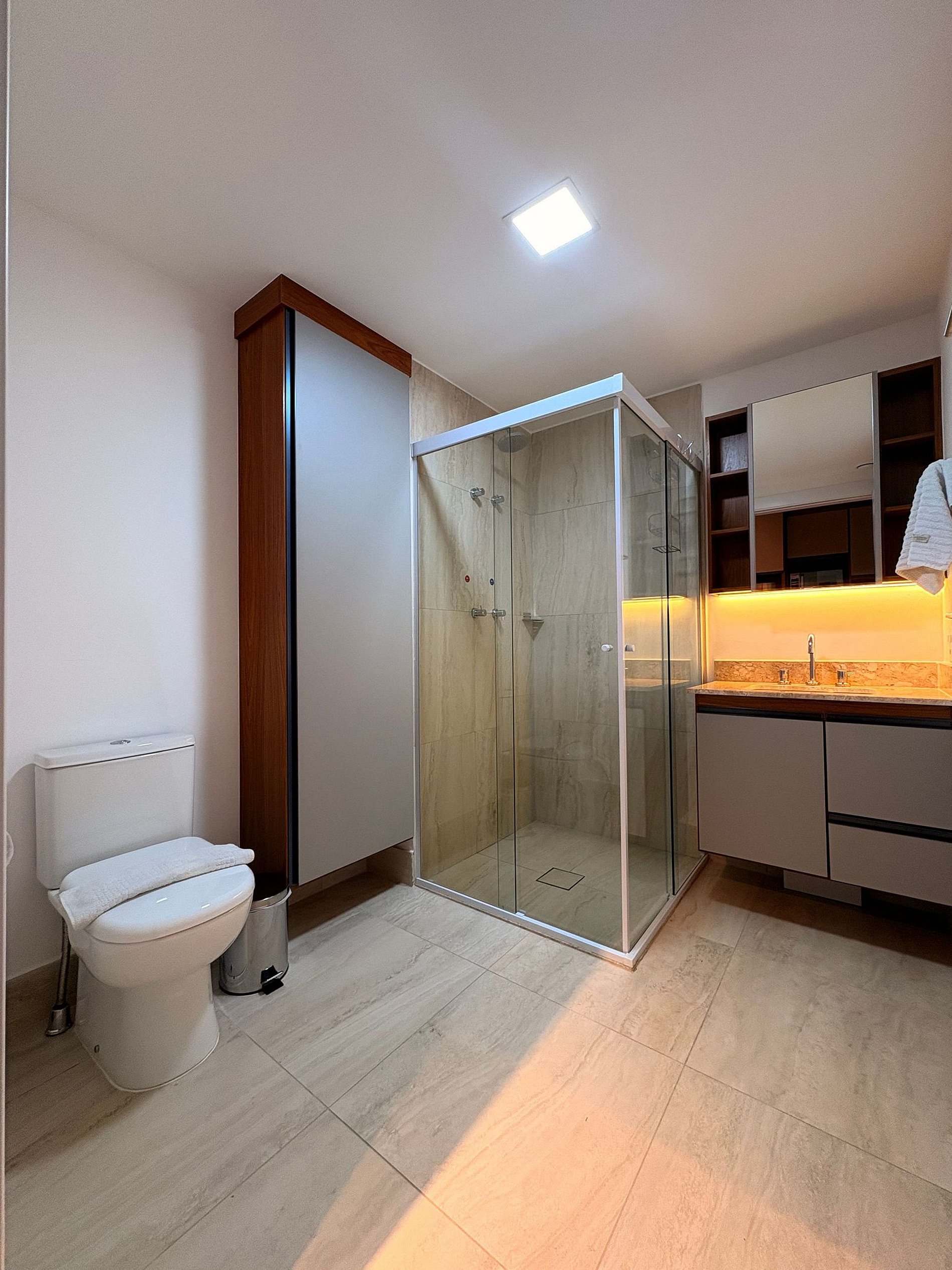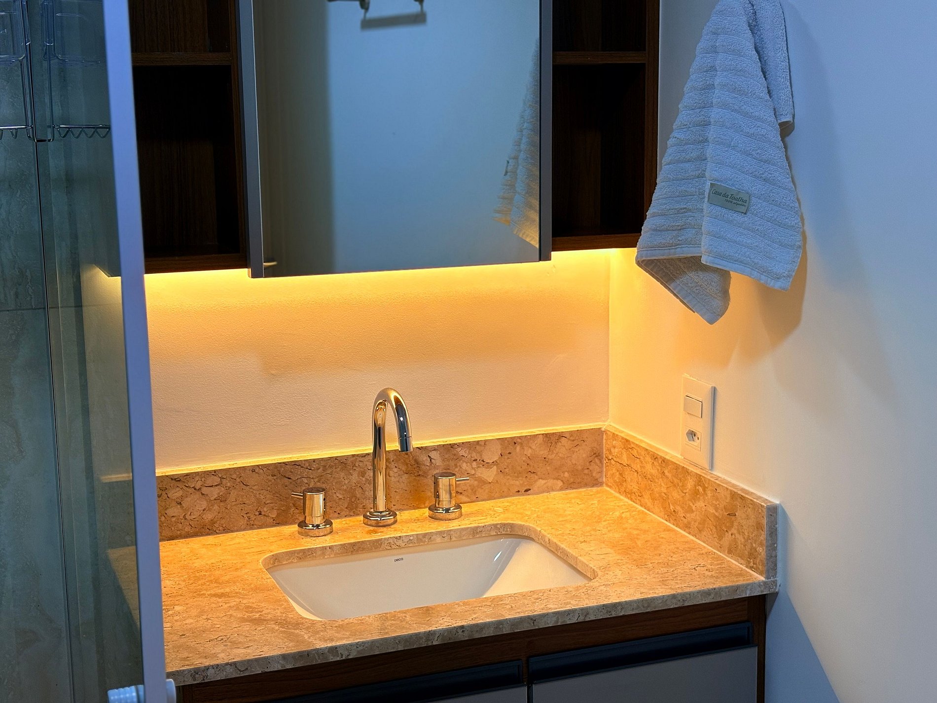 O banheiro é amplo e bem espaçoso. Para maior conveniência durante a estadia, o apartamento também oferece secador de cabelo e ferro de passar roupas.