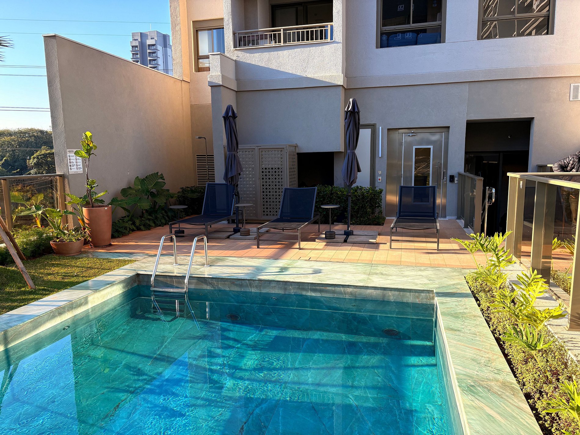O prédio conta com uma piscina de uso comum e uma academia completa, disponíveis para os hóspedes durante a estadia, conforme as regras e horários de funcionamento do condomínio.