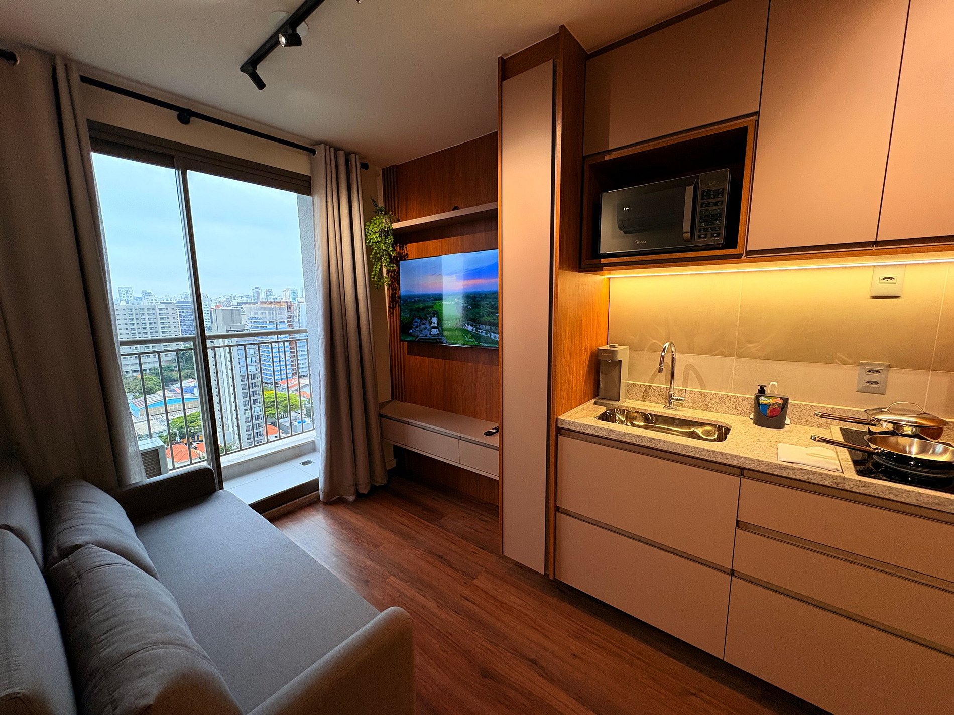 No 19° andar, com vista livre para Moema.