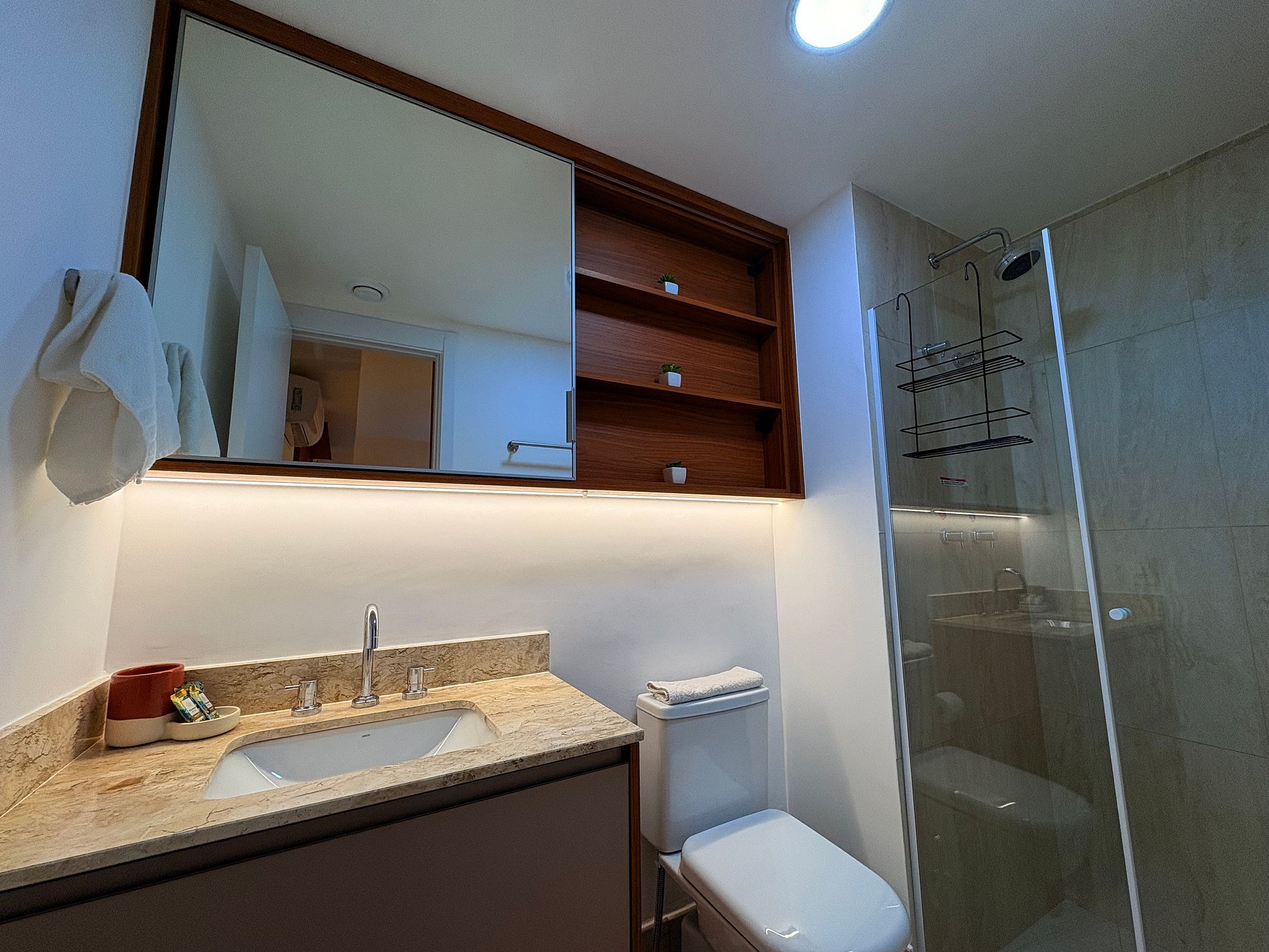 O banheiro é amplo e bem espaçoso. Para maior conveniência durante a estadia, o apartamento também oferece secador de cabelo e ferro de passar roupas.