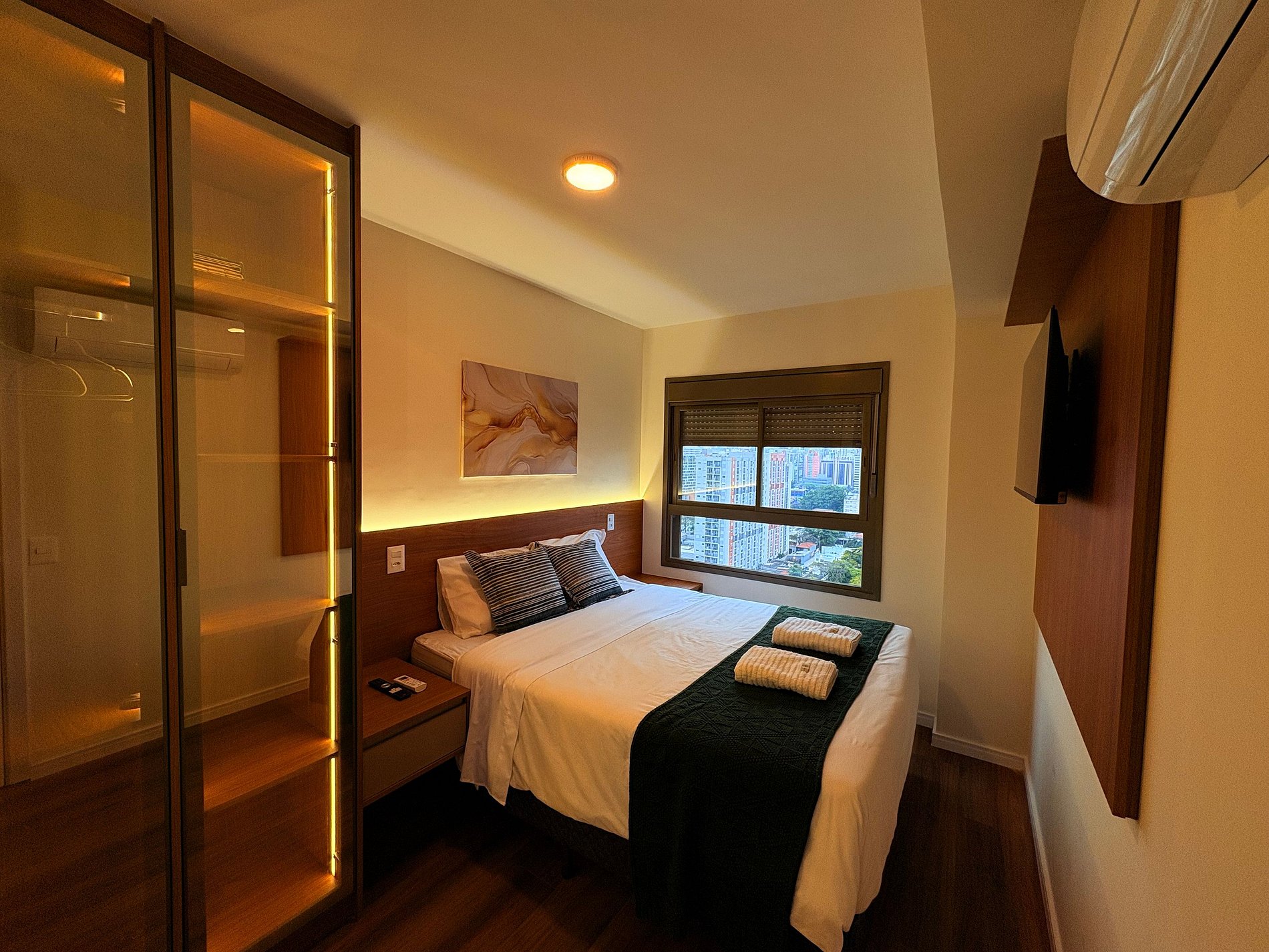 O apartamento fica no 19° andar, conta com uma suíte equipada com Cama Queen, ar-condicionado nos 2 ambientes, televisão smart e janela com sistema blackout. Para maior comodidade, oferecemos um enxoval completo por estadia, incluindo: 2 toalhas de banho, 1 toalha de rosto, 1 tapete de piso, 1 lençol com elástico, 1 lençol sem elástico, 2 fronhas e 1 edredom ou manta. Também disponibilizamos 2 amenities por hóspede e 1 rolo de papel higiênico por estadia.